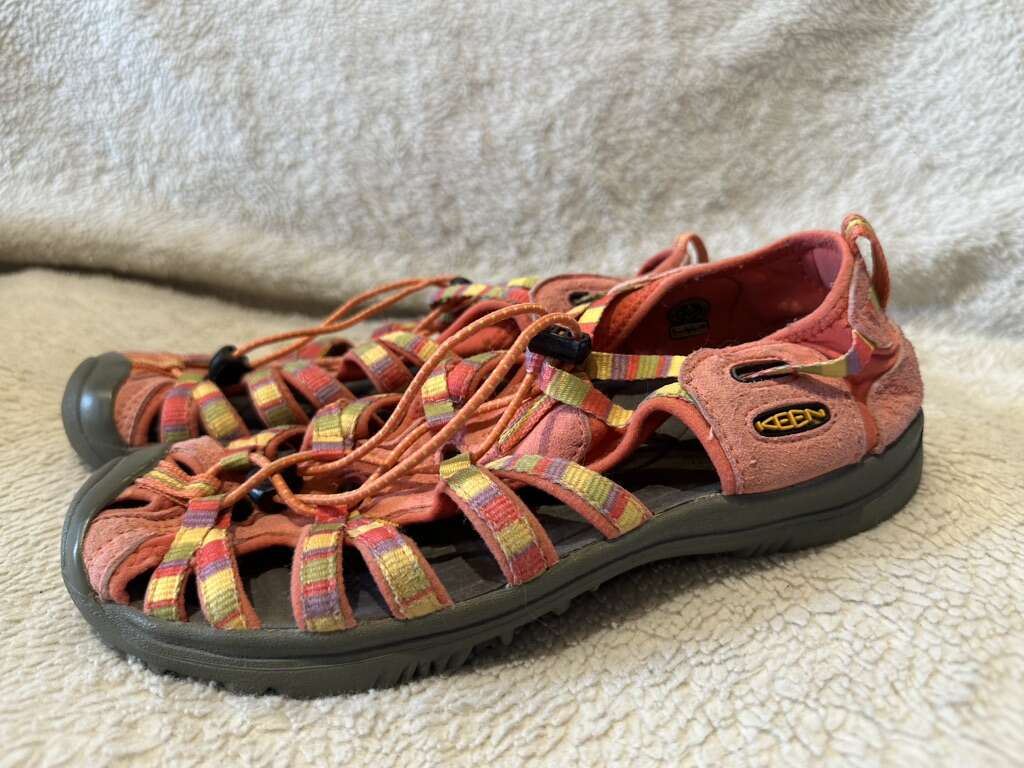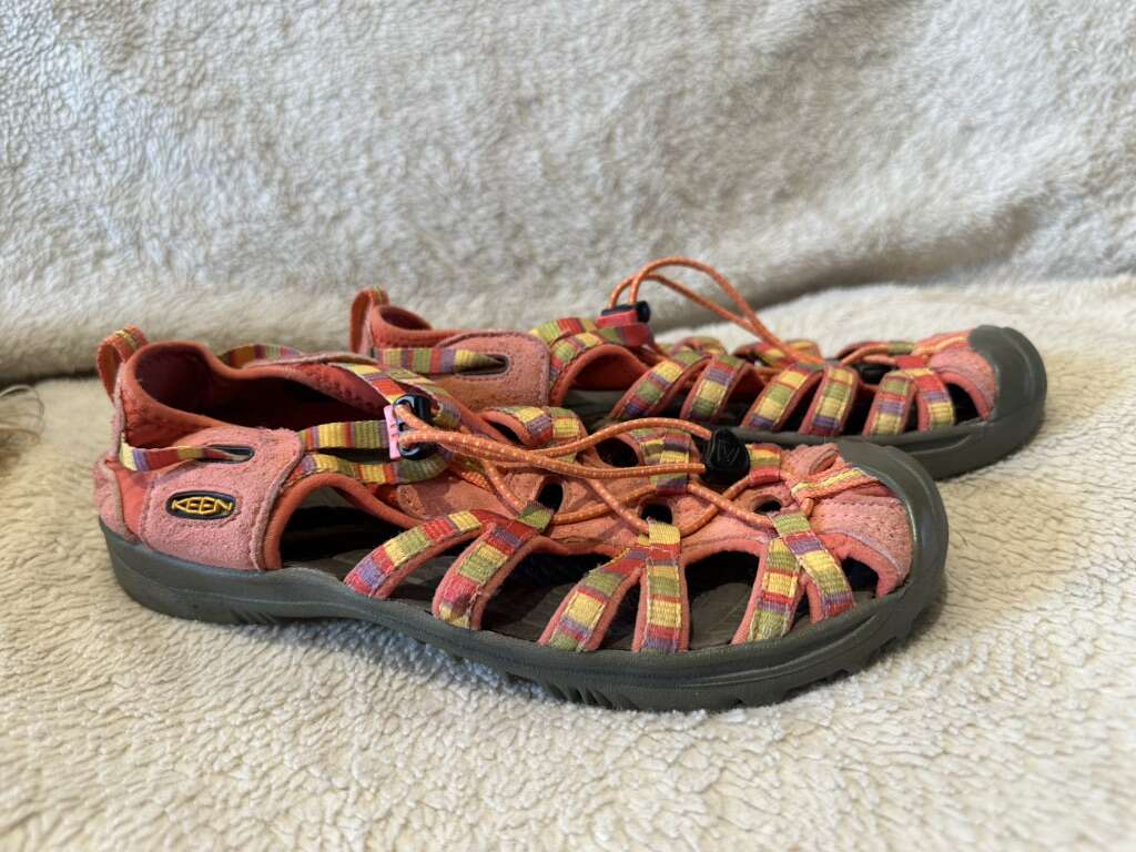 Keen youth size 6 peach with pastel stripes slim fit style waterproof, hiking sandals. These are in good condition, see photos for details. I take cash or Venmo, but cash is preferred. Text is best. 801-201-4446. Check out my other ads for additional sizes and styles.