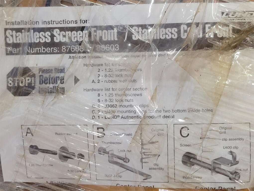 Lund Stainless Screen Front designed for enhanced protection and style. This product features a durable stainless steel construction, ensuring longevity and resistance to corrosion. It includes installation instructions and hardware components for easy setup.