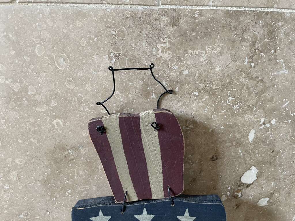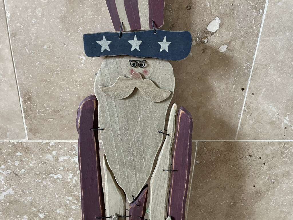 I have a cute patriotic Uncle Sam made of wood slats wired together. He has a wire loop on top for hanging him up. He has a rustic look and is about 22 inches tall. See my other ads for jewelry, artwork, home decor and more.