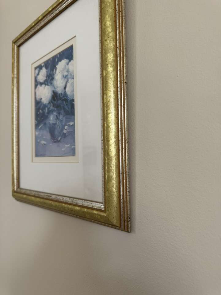 VenmoA bouquet of white roses sits gracefully in a clear glass vase, their delicate petals unfurling in soft, layered blooms. The vase, simple yet elegant, allows the lush green stems to show through, adding a touch of natural vibrancy. Surrounding the arrangement are dark navy accents. A gold frame encases the scene, its warm metallic sheen providing a striking contrast to the cool navy hues and the crisp white of the roses.
