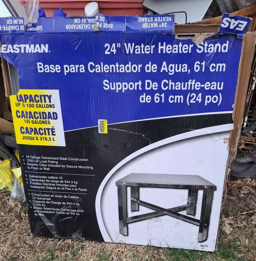 VenmoEastman 24 Inch Water Heater Stand with Screws, 75 to 100 Gallons Load Rate Brand: Eastman Capacity: 180.96 Liters Product Dimensions: 24.02"W x 17.99"H Special Feature: Safety Clips for Wall/Floor Fastening Color: Silver Material: Metal