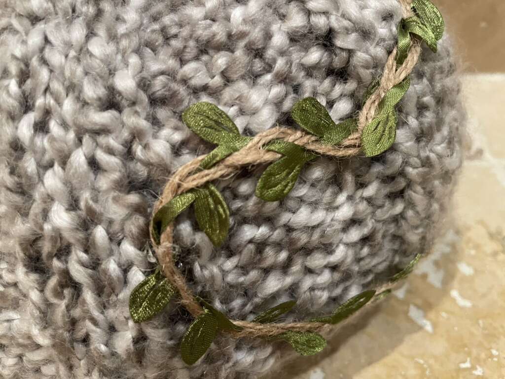 I have a soft gray crocheted pumpkin with beautiful leafy vines. It is about 9 1/2 inches across and 7 1/2 inches tall. It’s in great condition. See my other ads for jewelry, artwork, home decor and more.