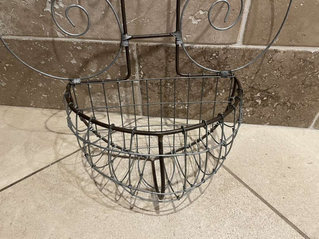 I have have a large metal wall hanging with a round basket on the bottom. It is a dark bronze metal with silver metal. It is 29 inches tall and 17 1/2 inches across at the widest point. See my other ads for jewelry, artwork, home decor and more.