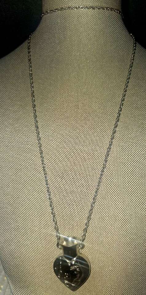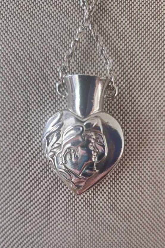 Vintage Silvertone VERY DETAILED Art Nouveau Egyptian style Woman Warrior open vase heart necklace, Excellent condition. Could be used as a snuff scent perfume bottle, smelling salts or small flower/herb vase. 32" chain with no clasp for easy on/off.