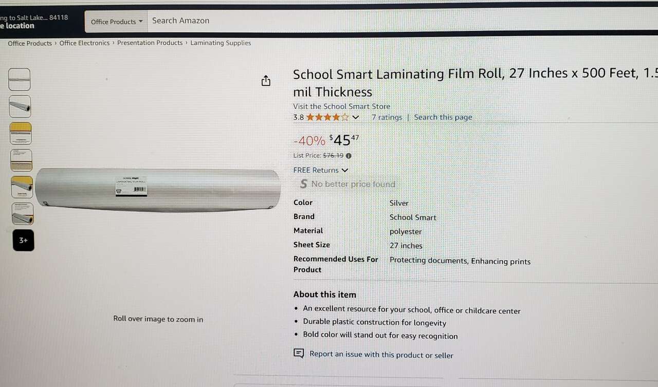 School Smart Laminating Film Roll, 27 Inches x 500 Feet, 1.5 mil Thicknes, 1 inch core. High gloss laminating film comes on a 1 inch core and is specifically for roller laminators. It is designed to work with all brands of laminators. One roll of 1.5 mil thick laminating film is specifically made to fit on roller laminators and any brand of heat seal laminator for use at home, school, or office. New never been used. Product information: Shape: Rectangular Paper Finish: High Gloss Size: 27 Inches x 500 Feet - 1.5 mil Thickness Product Dimensions: 6000"L x 27"W UPC: 885634015237 Manufacturer: School Specialty Item Weight 6.1 pounds Item model number: 1277262 Is Discontinued By Manufacturer: No Material Type: polyester Manufacturer Part Number: 127726