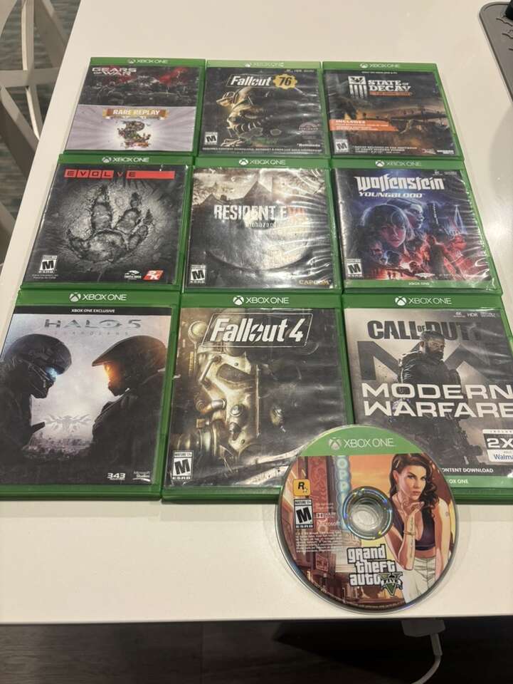 Wolfenstein Youngblood-$10 Fallout 76-$7 Gears of War Ultimate Edition and Rare Replay-$11 State Of Decay: Year-One Survival Edition-$13 Resident Evil 7 biohazard-$10 Evolve-$6 Call of Dury Modern Warfare-$10 Fallout 4-$7 Halo 5 Guardians-$8 GTA V Xbox One-$8 (SOLD)