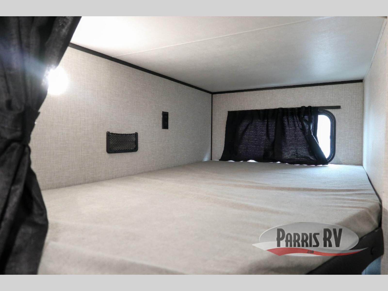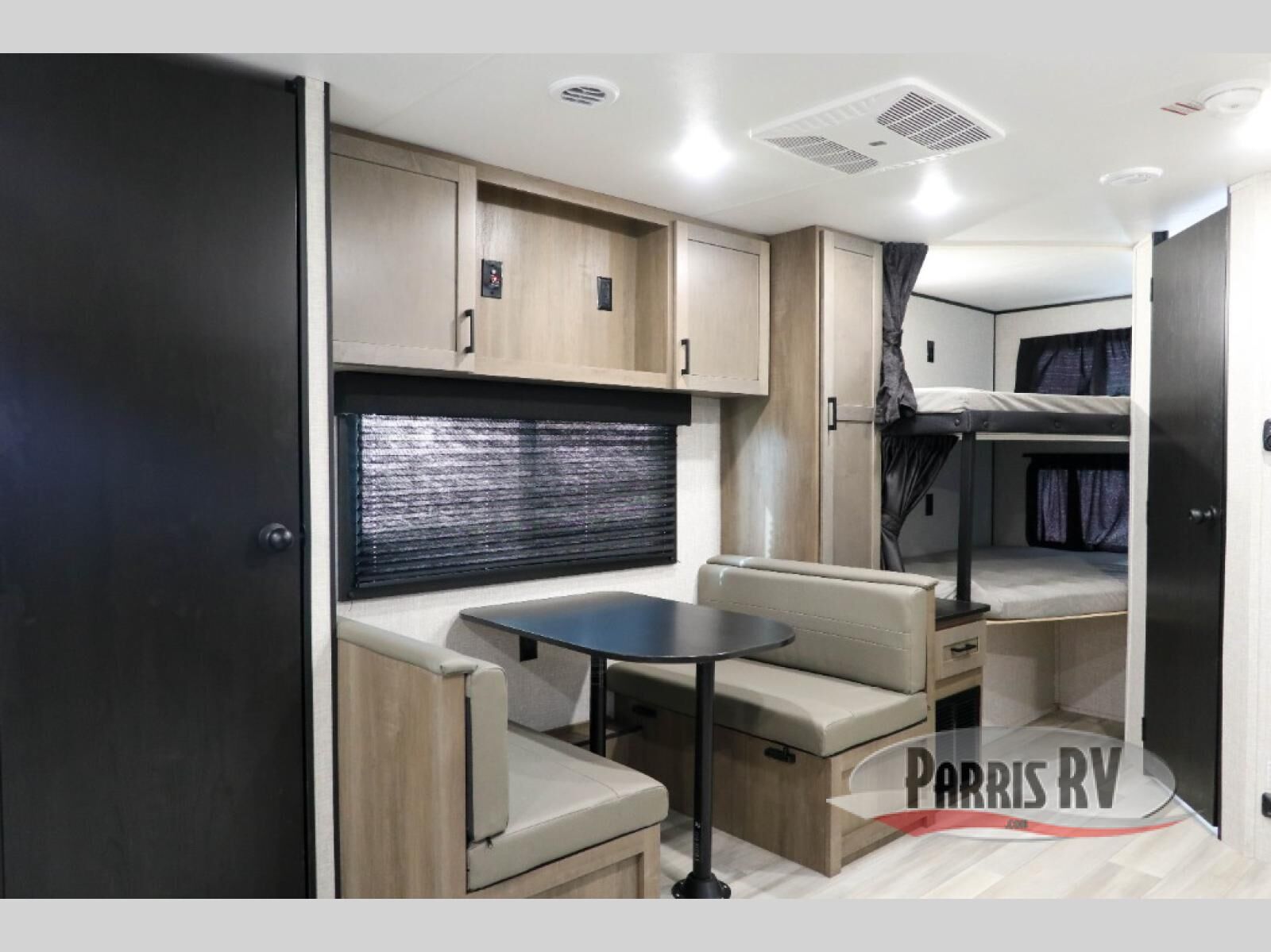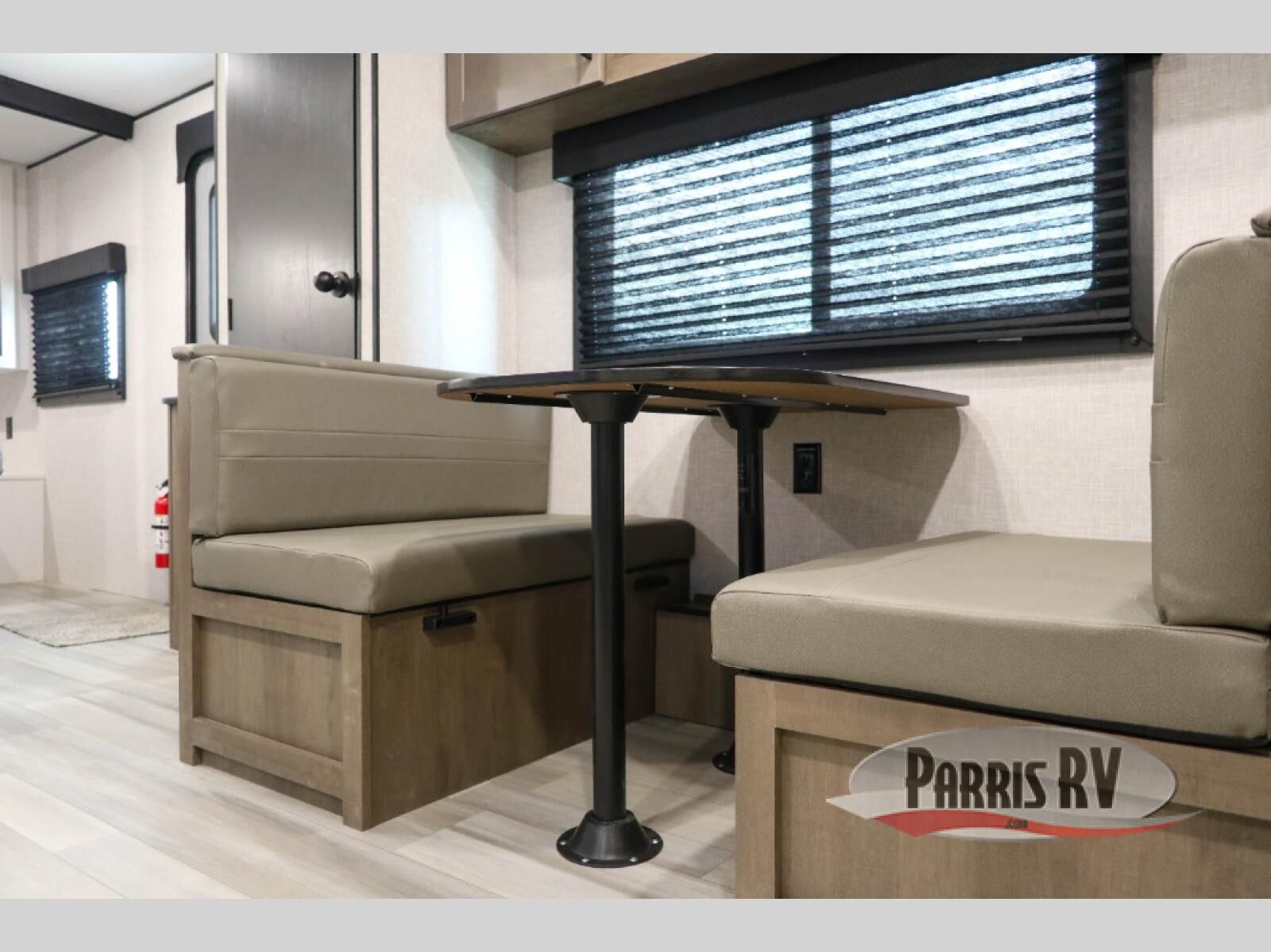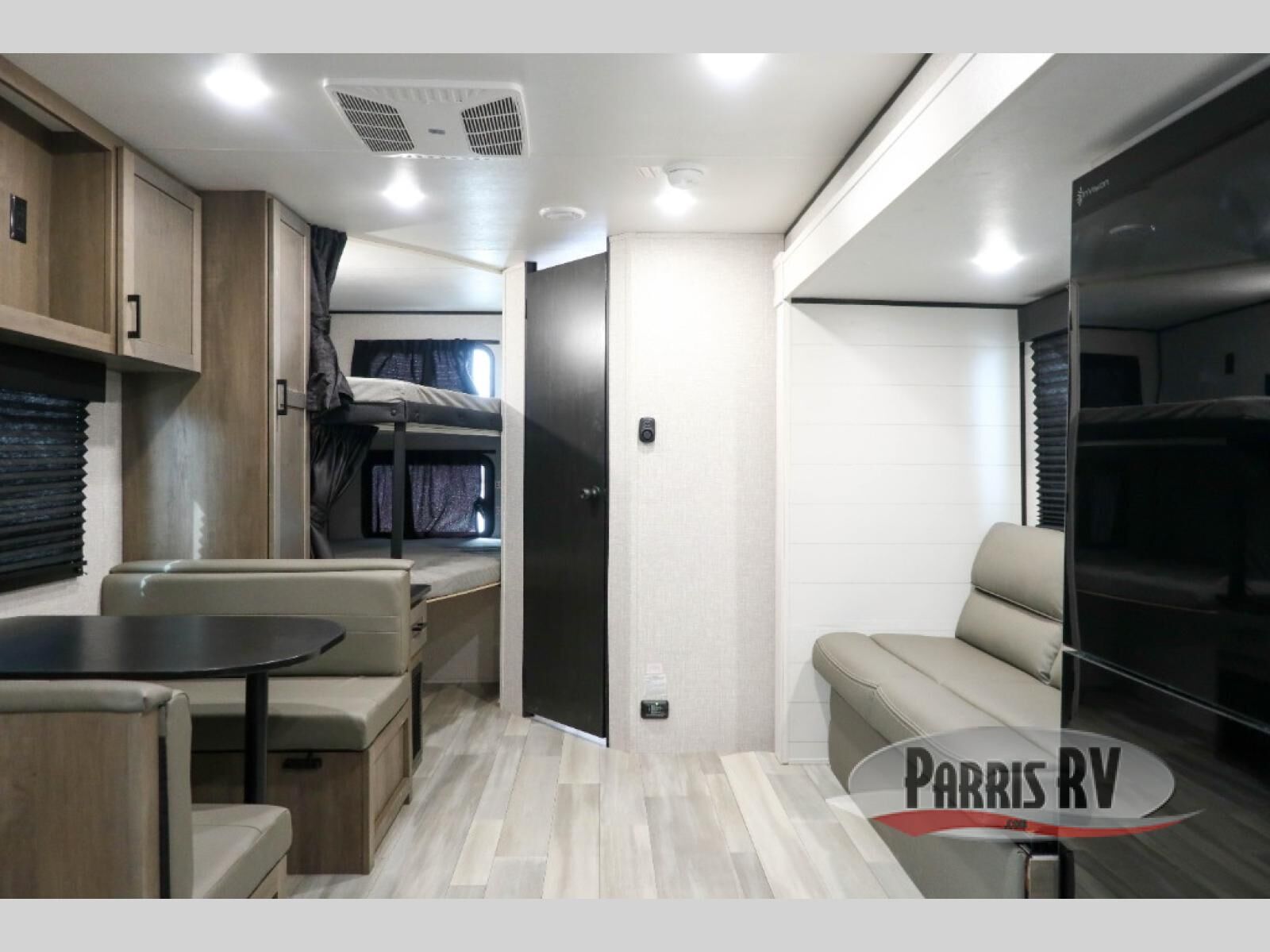 This dual-axle travel trailer can sleep eight people each night, so invite your family or friends along. You will enjoy the private bedroom up front with dual wardrobes to keep your clothes tidy. While the chef of your group is preparing lunch on the three burner cooktop, everyone else can visit on the jack-knife sofa or play a game at the booth dinette. You will also find an 18' power awning with LED lights outdoors which is where you may usually find everyone. The walk-in pantry and additional storage beside the pantry will let you keep snacks, paper goods, and more fully stocked. And the private bathroom is right next to the double-size bunks for added convenience.