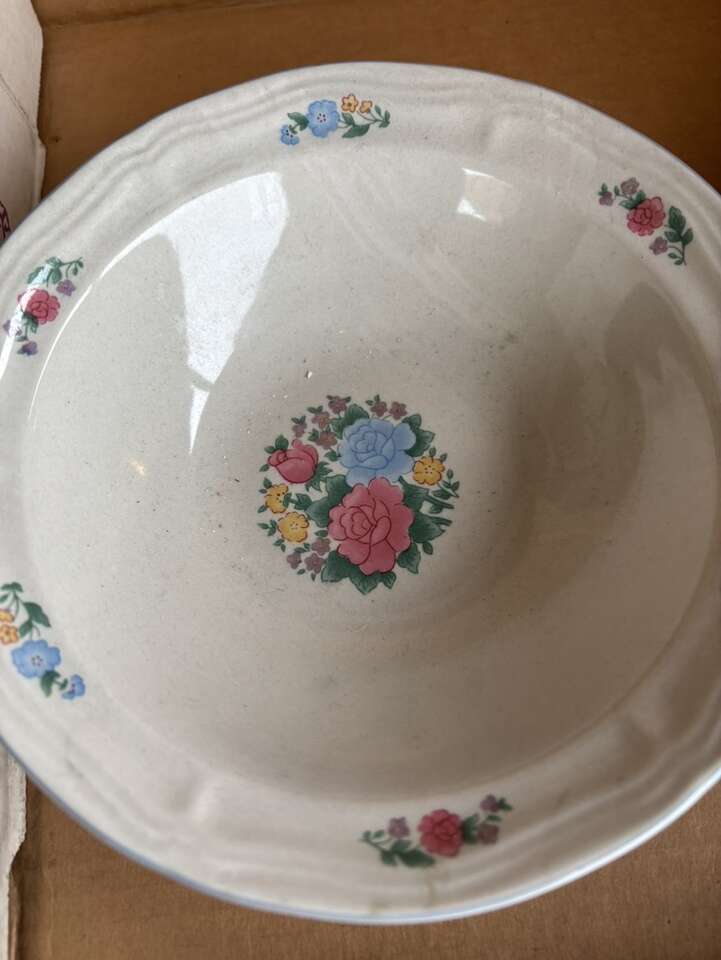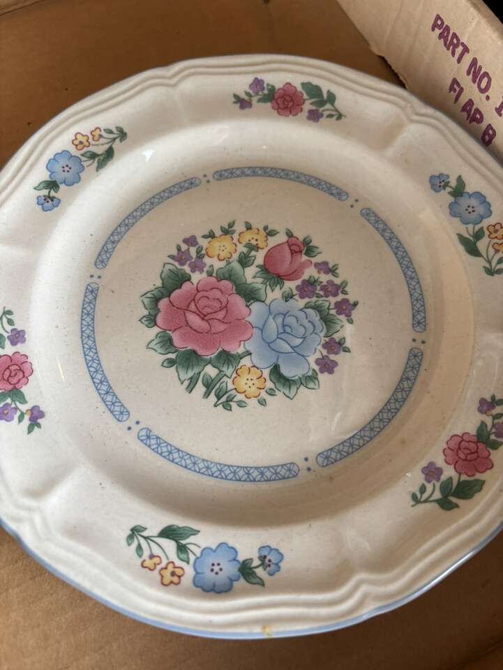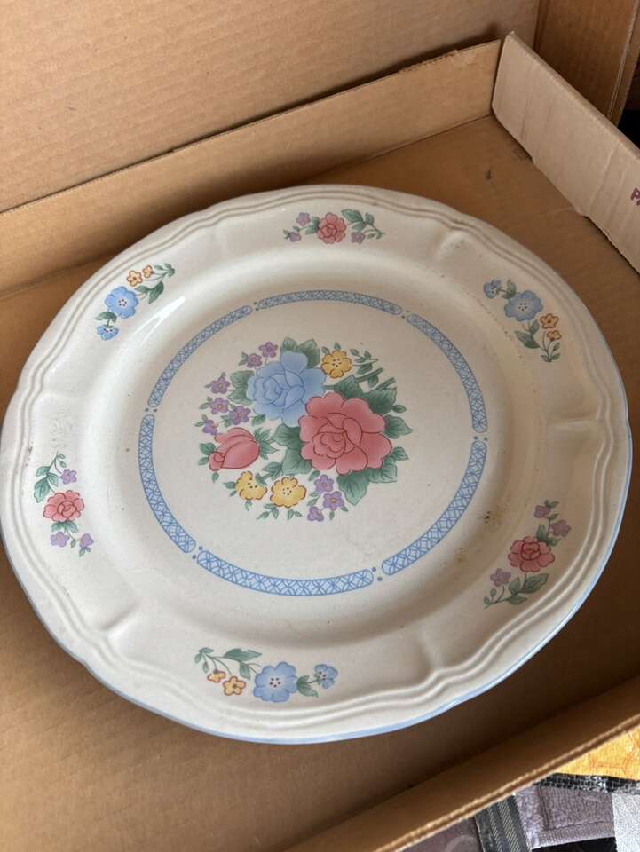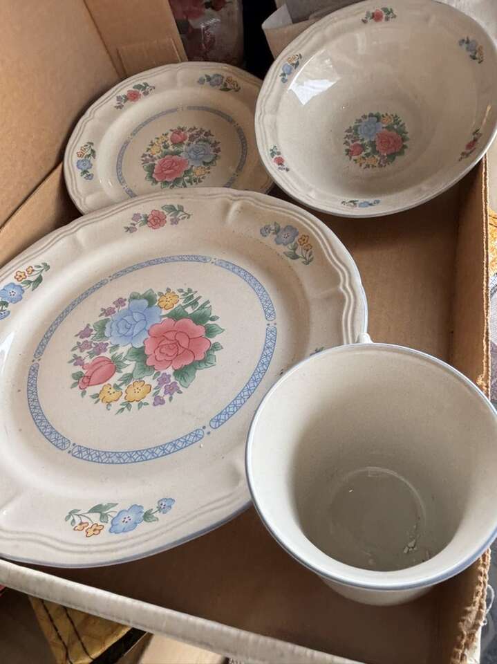 Venmo4sets of 4 place settings. 4 large plates, 4 small plates, 4 bowls, and 4 cops. They are not chipped, but they are used.