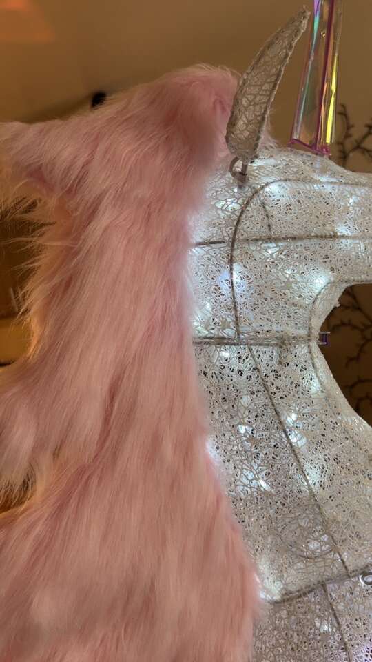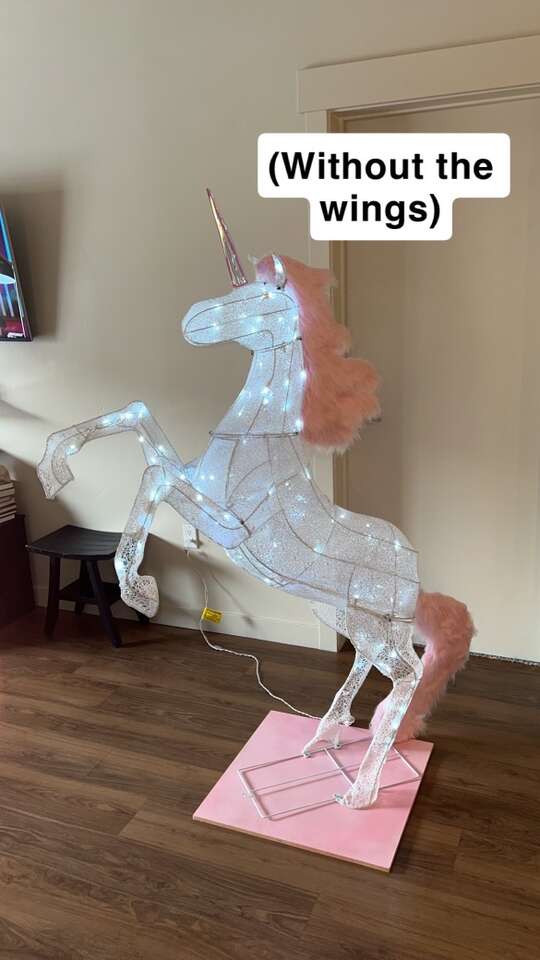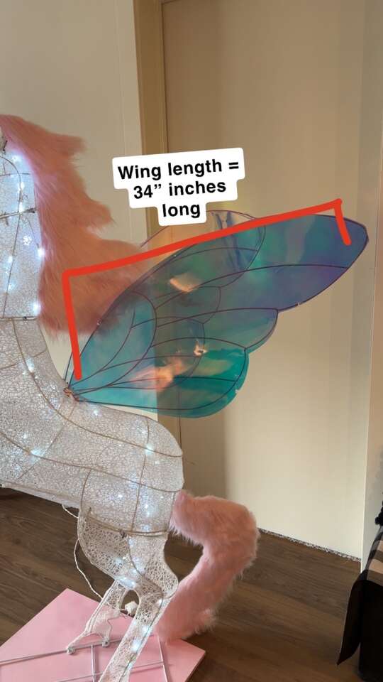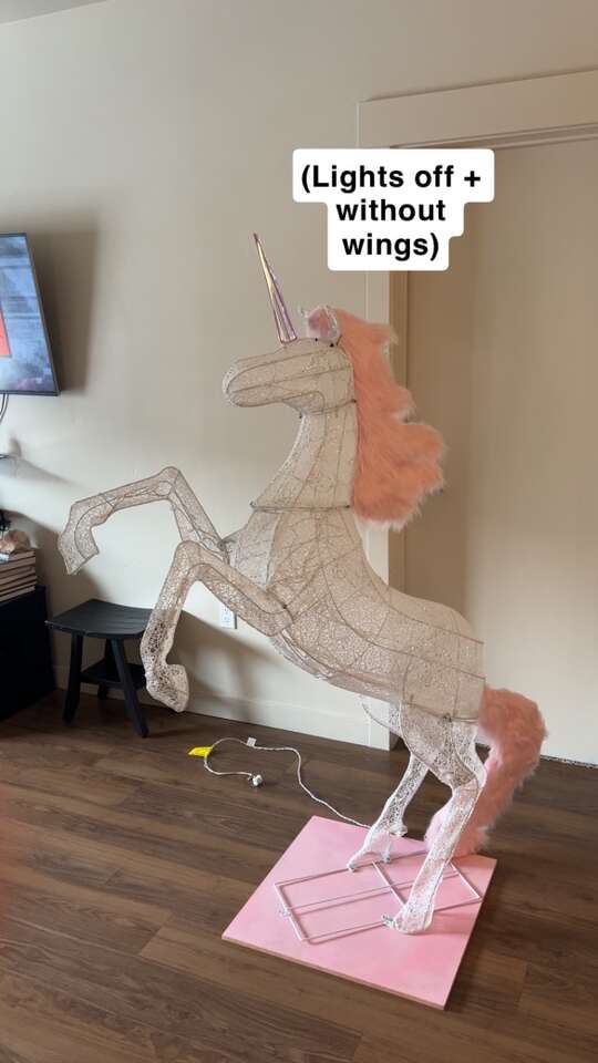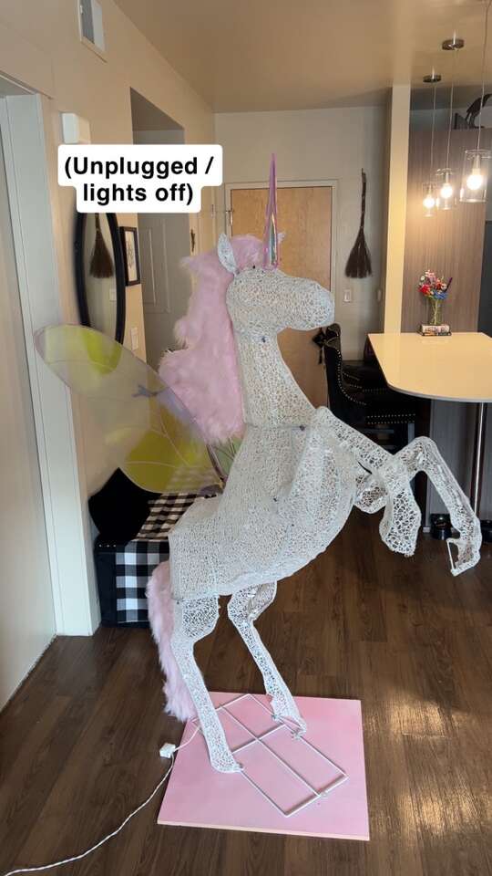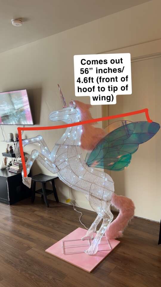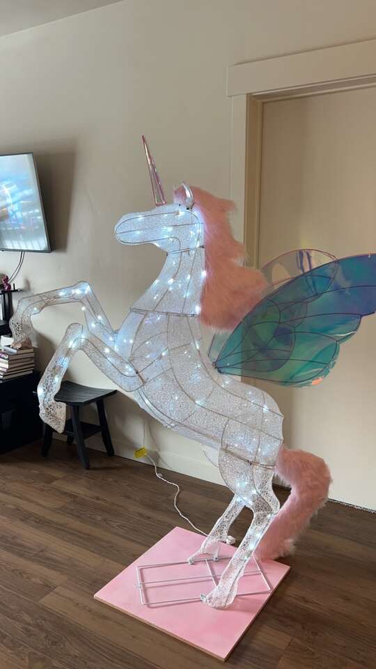 VenmoMeasurements: •Total Height (from platform base to tip of horn) = 6ft •Wings = 34” inches long •Base platform = 2ft x 2ft •Comes out 56” inches (from the farthest point on the front hooves to the back tip of the wing) •Refer to all the pictures with measurements to really get a good idea/see what I’m talking about Features: •160 cool-white LED lights that twinkle •iridescent wings (2) • pink faux fur mane and tail •iridescent horn •matching pink custom-made wooden base/platform for extra stability, making it super sturdy •discrete outlet plug-in wire to turn the lights on/off