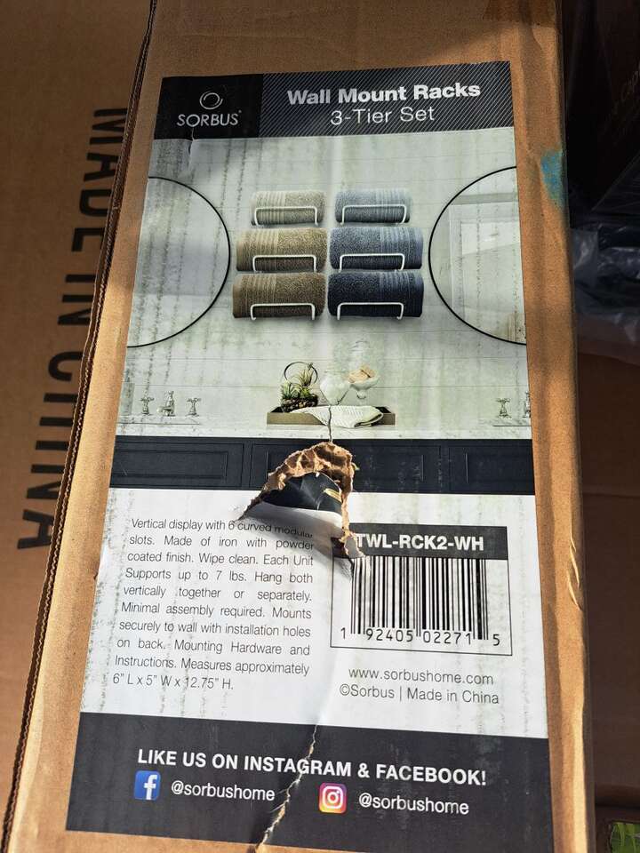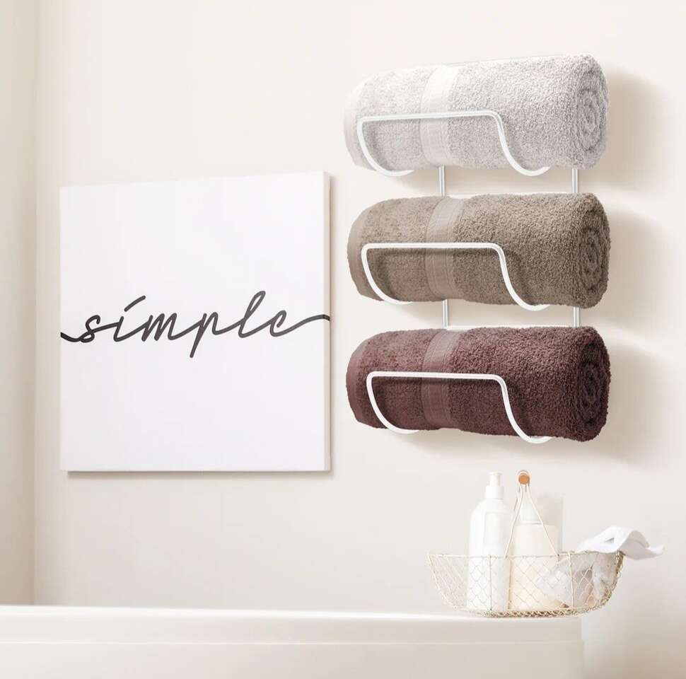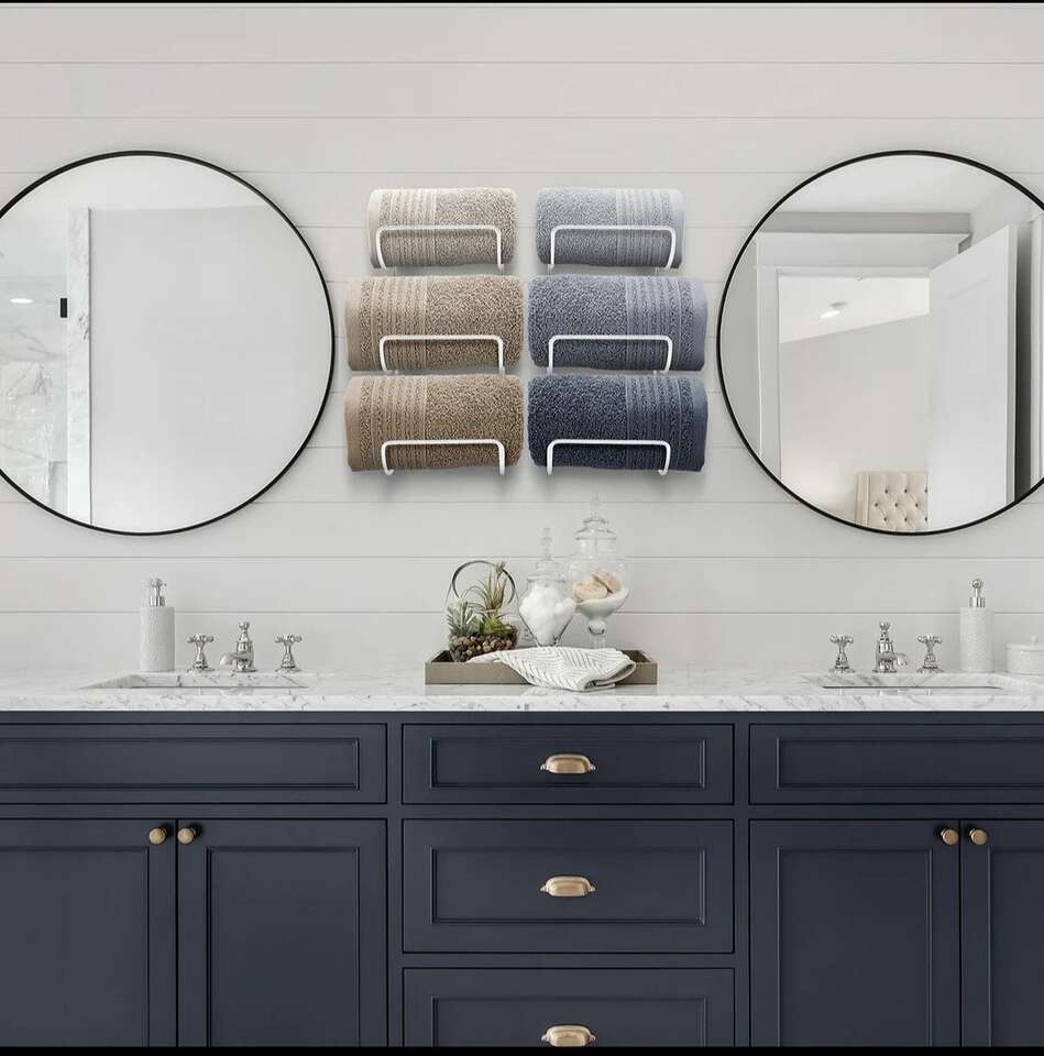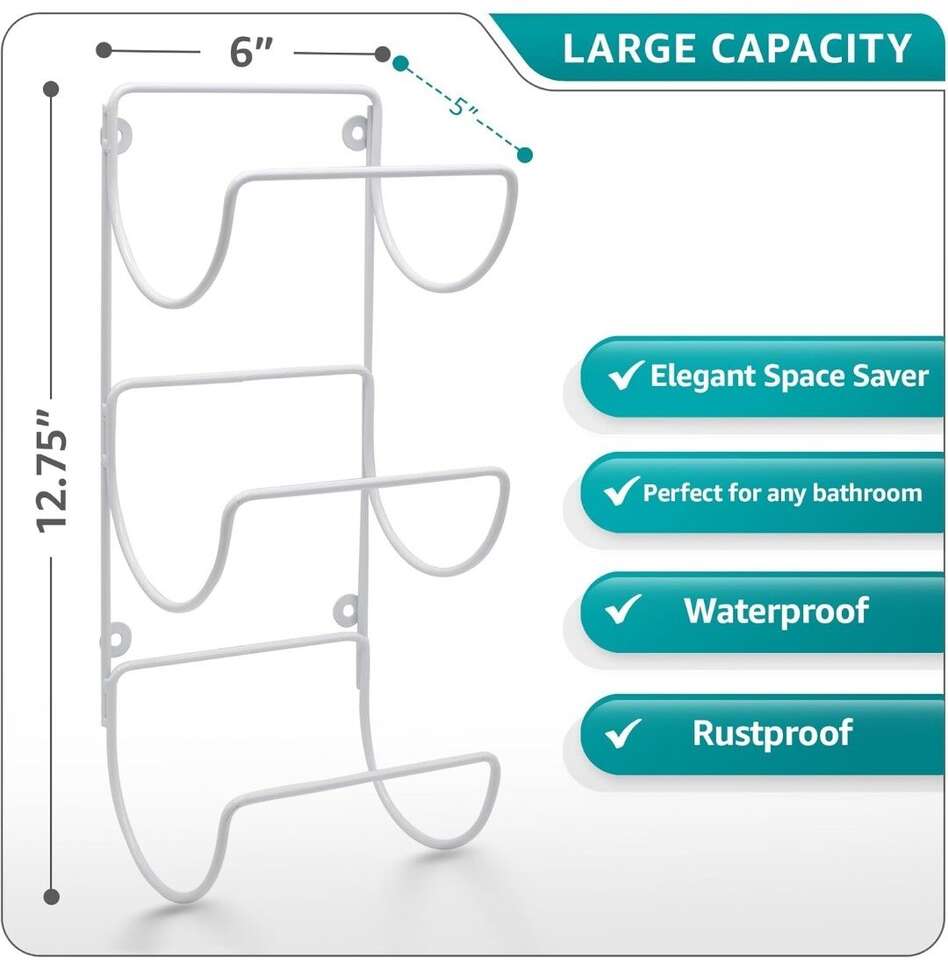 Venmo6 Tier Towel Racks for Bathroom: (Set of 2, White) Gain vertical storage for your favorite bath towels with the Sorbus Bathroom Towel Storage Rack - Provides wall-mounted storage for your linens in one convenient place - These bathroom towel holders are sturdy and easy to assemble - Supports up to 15 lbs Multi-Purpose: Use our bathroom towel racks for bathroom wall storage, poolside beach towels, tea towels, hand towels, washcloths, linens - The Sorbus Towel Holder Stand is suitable for camper decorations for inside bathroom, spa, sauna, salon, meditation room, RV bathroom storage, entryway, bedroom, bath decor, laundry area, dining room, restaurant, & bar Wall-Mounted Space-Saver Towel Organization: Wall towel rack for rolled towels displays rolled bath towels, hand towels, and washcloths - Versatile storage towel racks for any space in the home or pool - Can be used as a towel holder for bathroom door, bathroom decor sets, bathroom accessories decor, wall towel rack, pool towel holder, & shower towel holder 2 Hang Options: Hang both vertically together or separately - Minimal assembly required - Mounts securely to wall with installation holes on back - Mounting Hardware and Instructions INCLUDED - Bathroom door towel rack features a vertical display with 6 curved modular slots Durable Modern Design: Vertical display with 6 curved modular slots - Fits most decor styles whether classic, industrial, modern, or farmhouse - Made of iron with powder coated finish - Wipe clean - Measures approximately 6” L x 5” W x 12.75” H Sorbus set of 2 towel rack wall mounted Fits most decor styles whether classic, industrial, modern, or farmhouse - Made of iron with powder coated/chrome finish.