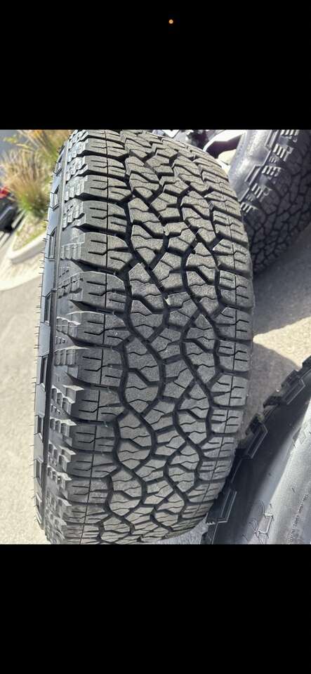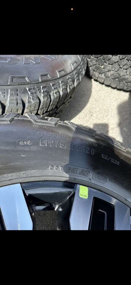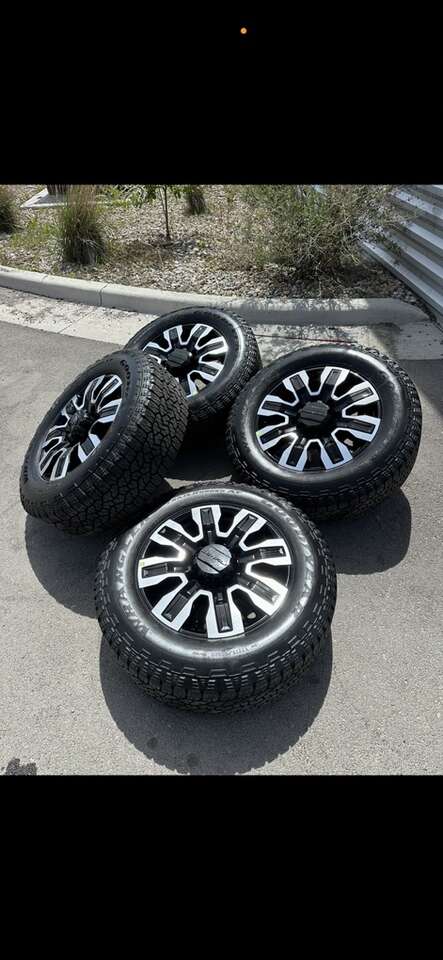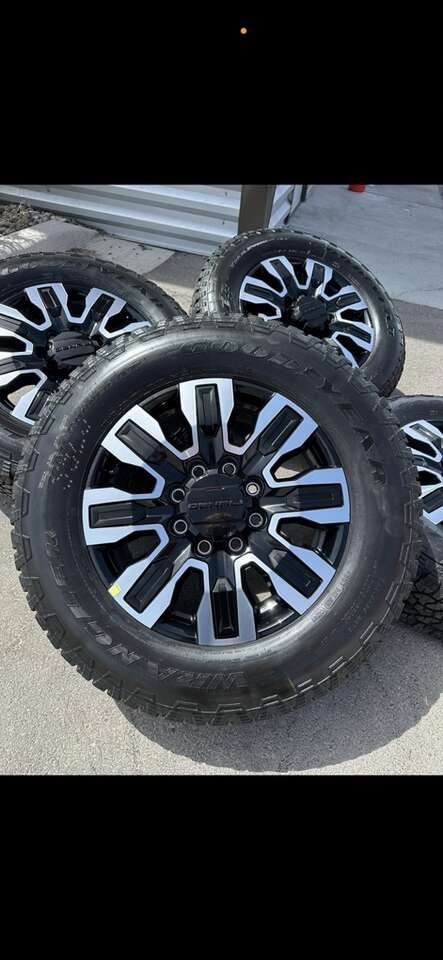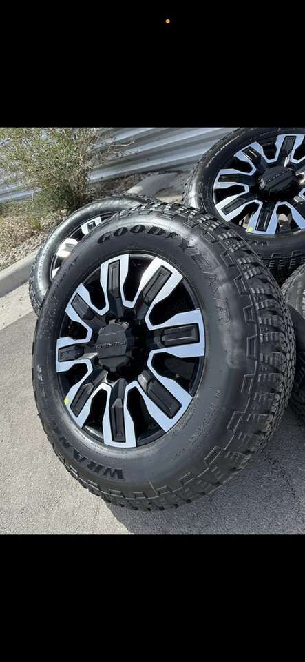 Wheels are 20” OEM wheels off a 2025 gmc 3500 Denali package. Wheels are in perfect condition, no curb rash, dings or major damage on them. Wheels look as if they just rolled off the assembly line. All center caps, and lug nuts are also included. Tires are 275/65/20 Goodyear wrangler all terrain, load range E, 10ply, top of the line tires, no patches or plugs in them, tires have less then 50 miles so they are practically brand new.