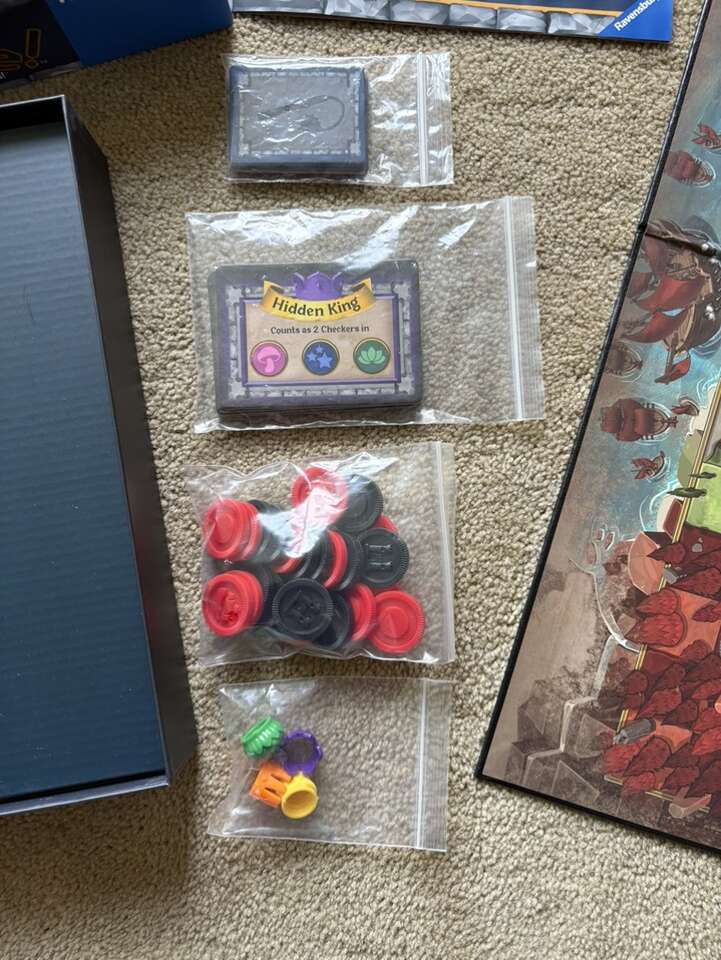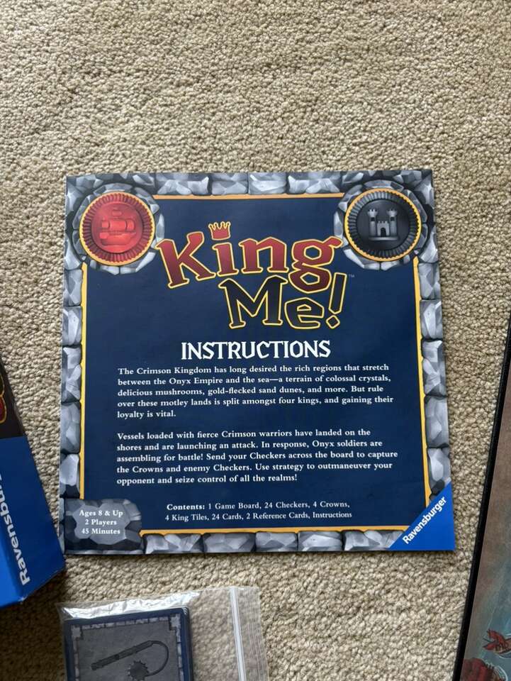 COMPLETE King Me! Board Game: Capture the crowns! Capture the realms! A fantastical take on classic checkers. Ages 8+, 2 players. By Ravensburger, 2019. Complete, no missing pieces. Excellent condition. Text only. Cash or Venmo.