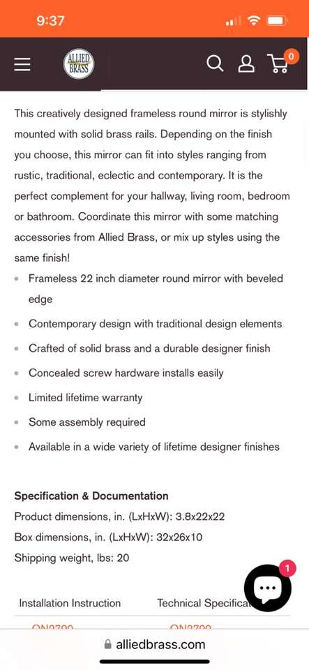ApplePayNew- in box. Allied Brass brand. Frameless 22” mirror. Retail price $605/on sale for $423.50 on website.