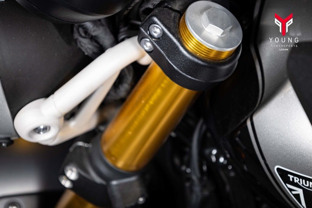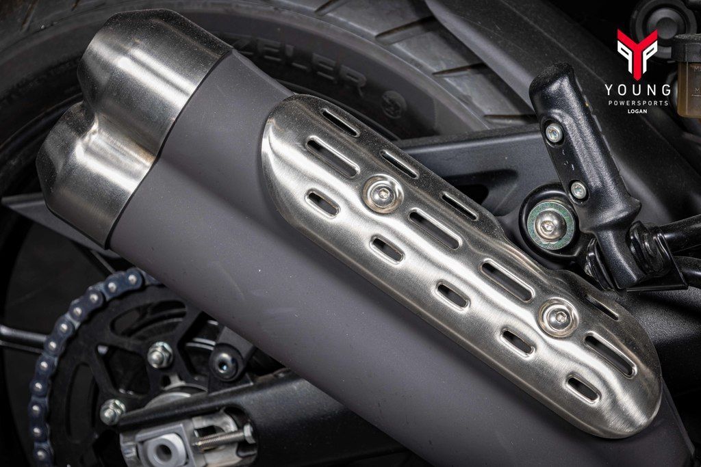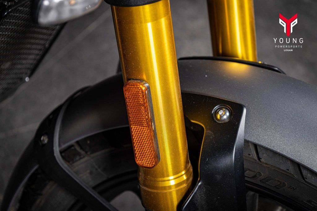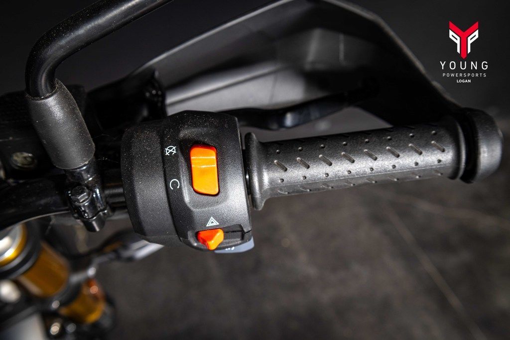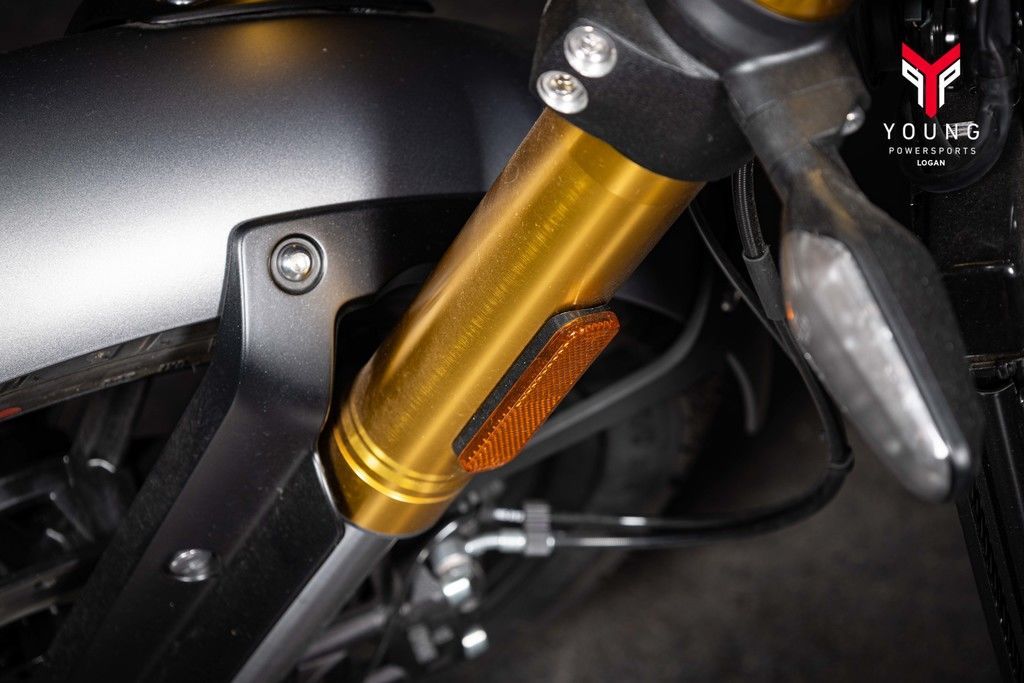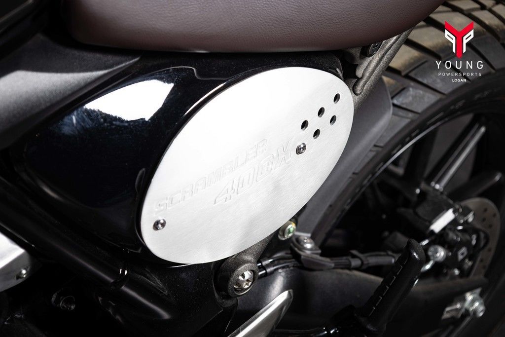 Trademark black powder-coated engine casings, tough gold anodized forks, high-quality paint, and exquisite logo detailing ensure the finish on the Scrambler 400 X is premium throughout.