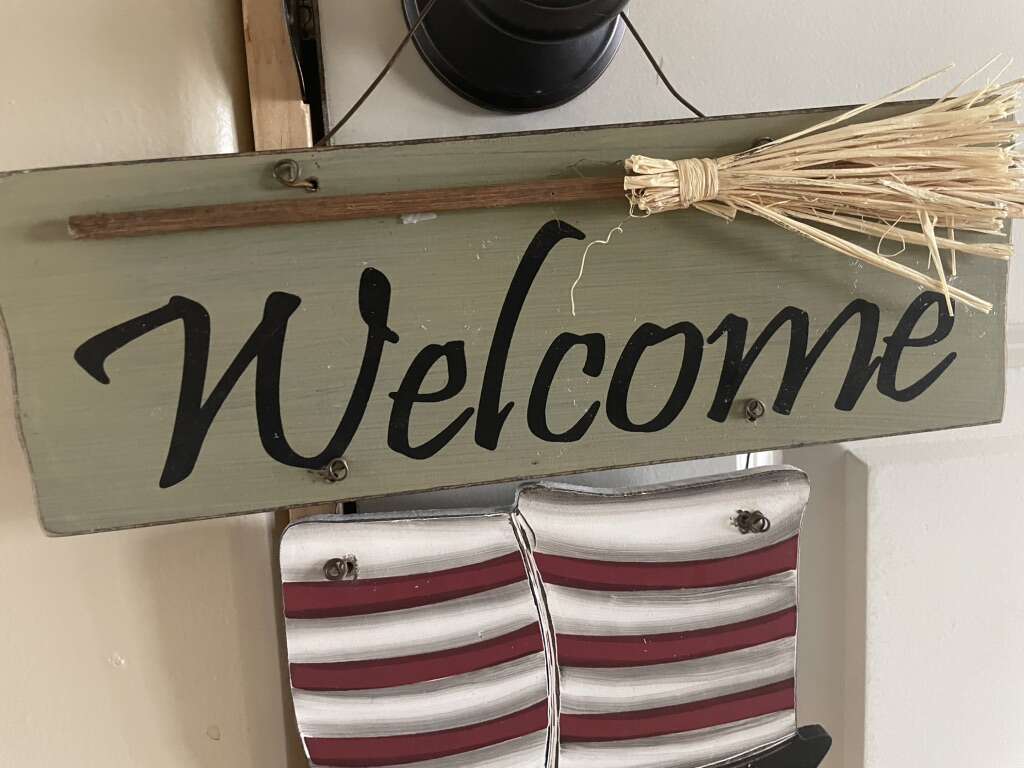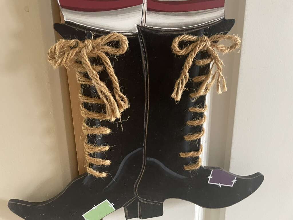 I have a cute hanging Halloween welcome sign. The witch’s boots have rope laces and the broom has straw. It’s probably made of MDF. It’s it great condition. It is just under 17 inches tall without the wire hanger and 19 inches with it. It’s 12 inches wide. See my other ads for jewelry, artwork, home decor and more.