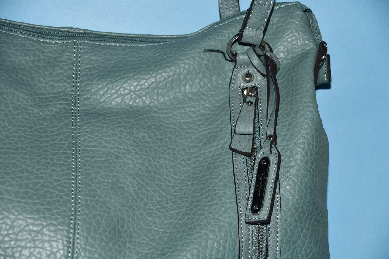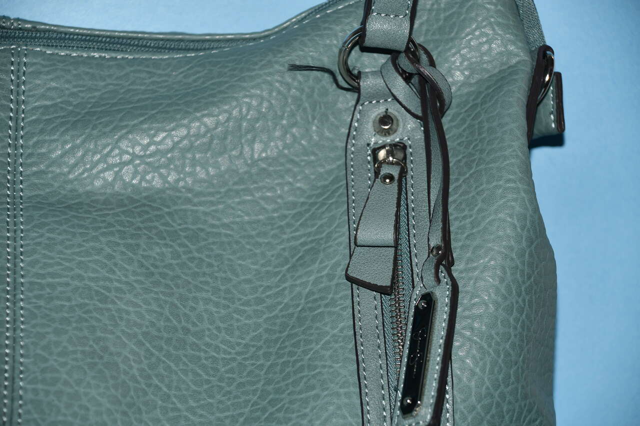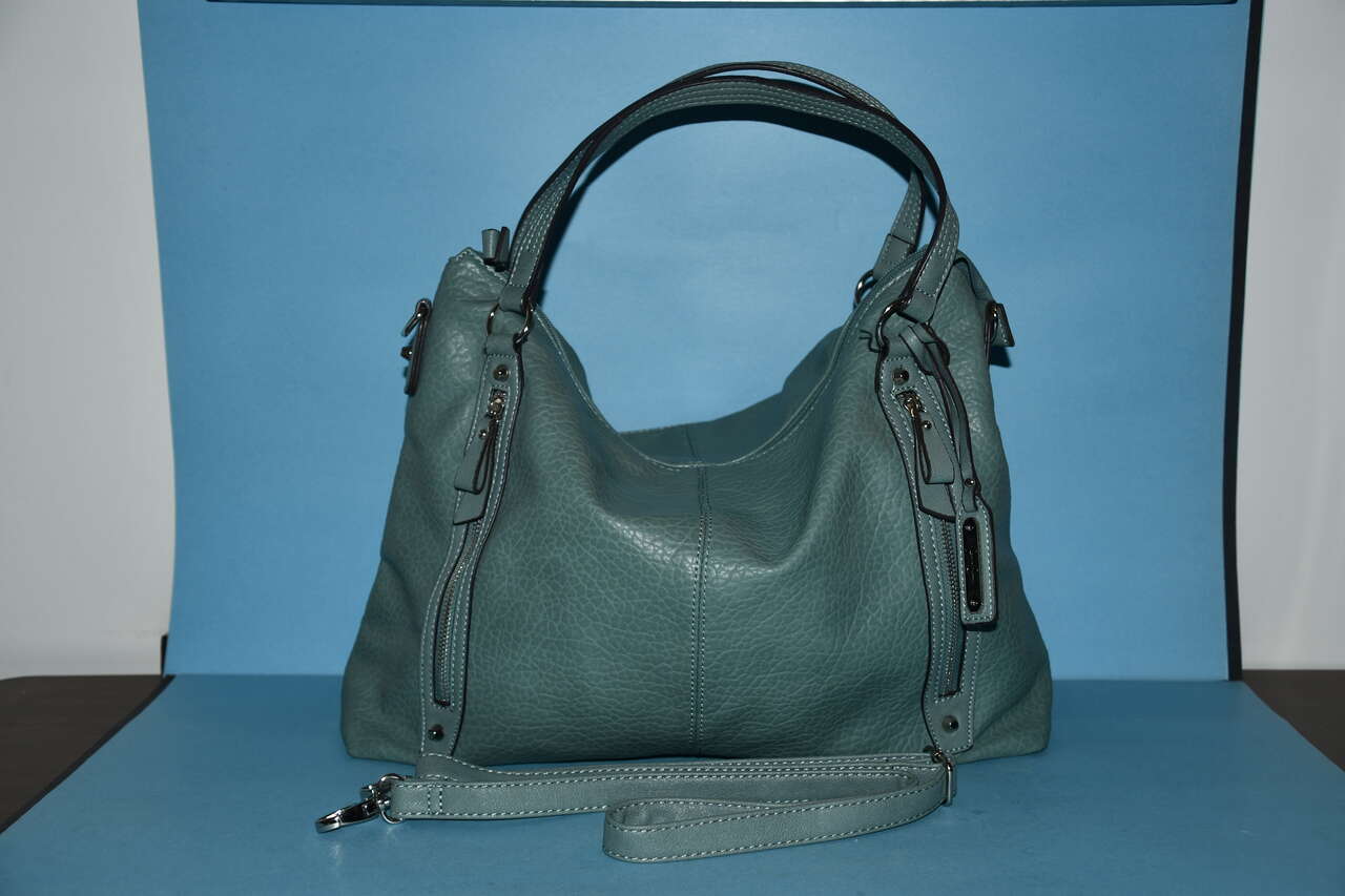This JESSICA SIMPSON BLUE HANDBAG is about 12" x 16" x 4.5". It has a removable shoulder strap. It has 2 front zippered compartments and a zippered compartment on the back. The top is zippered and opens to 2 open pockets & a zippered pocket. It is CLEAN! Questions??? Please ask. We are located in Plain City. Cash only please.