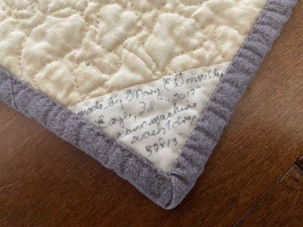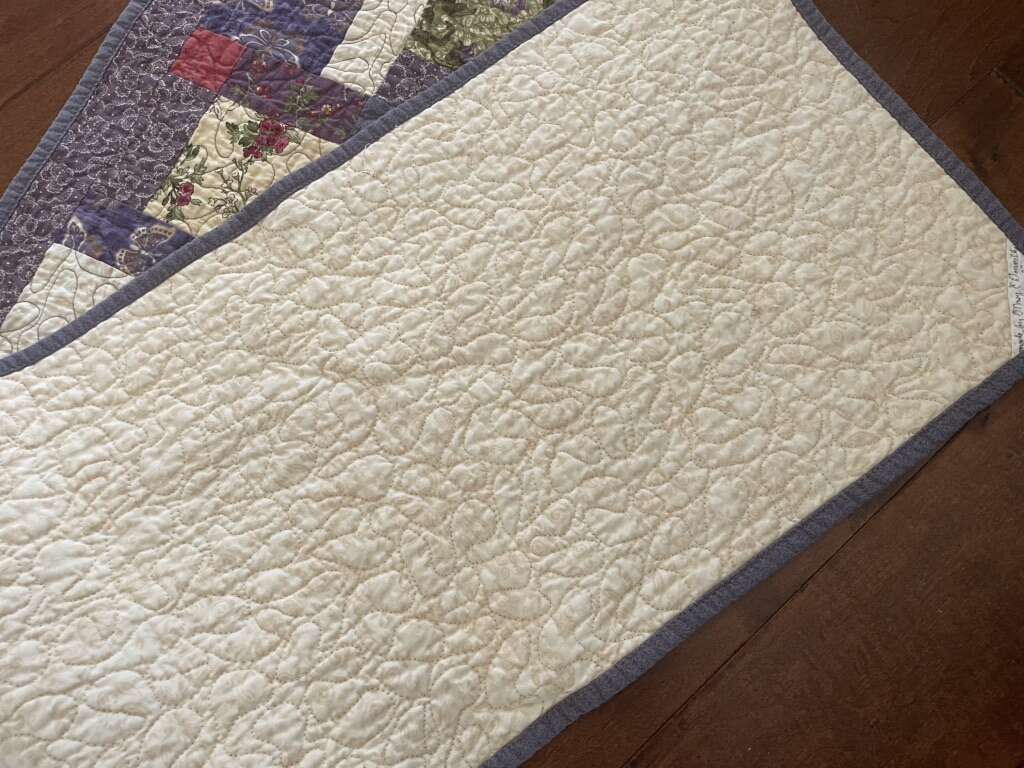 I have a beautiful quilted table runner in great condition. It is purple with off white, greens and dark pink. The fabrics have flowers and butterflies. The back is off white. The corner of the back has a small label with the maker and date. It is 50 inches by 13 inches. See my other ads for jewelry, artwork, home decor and more.