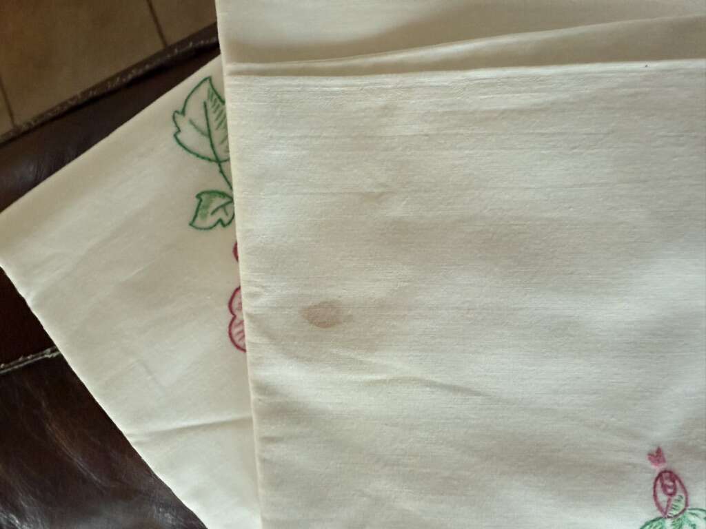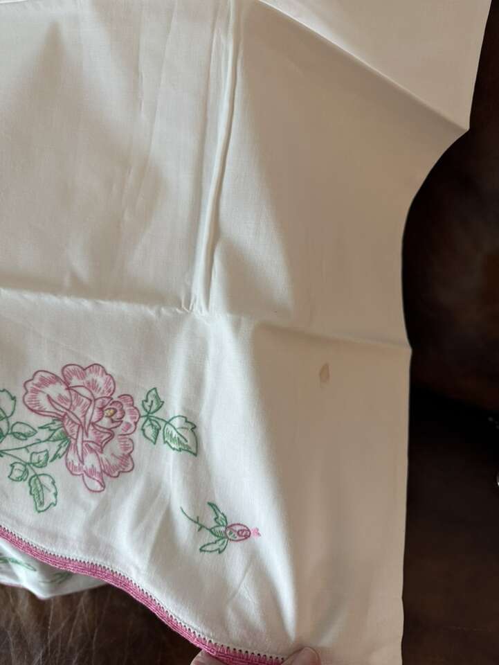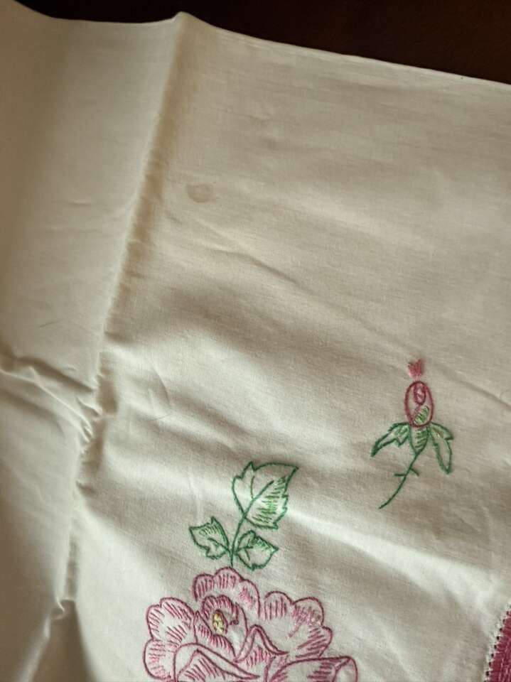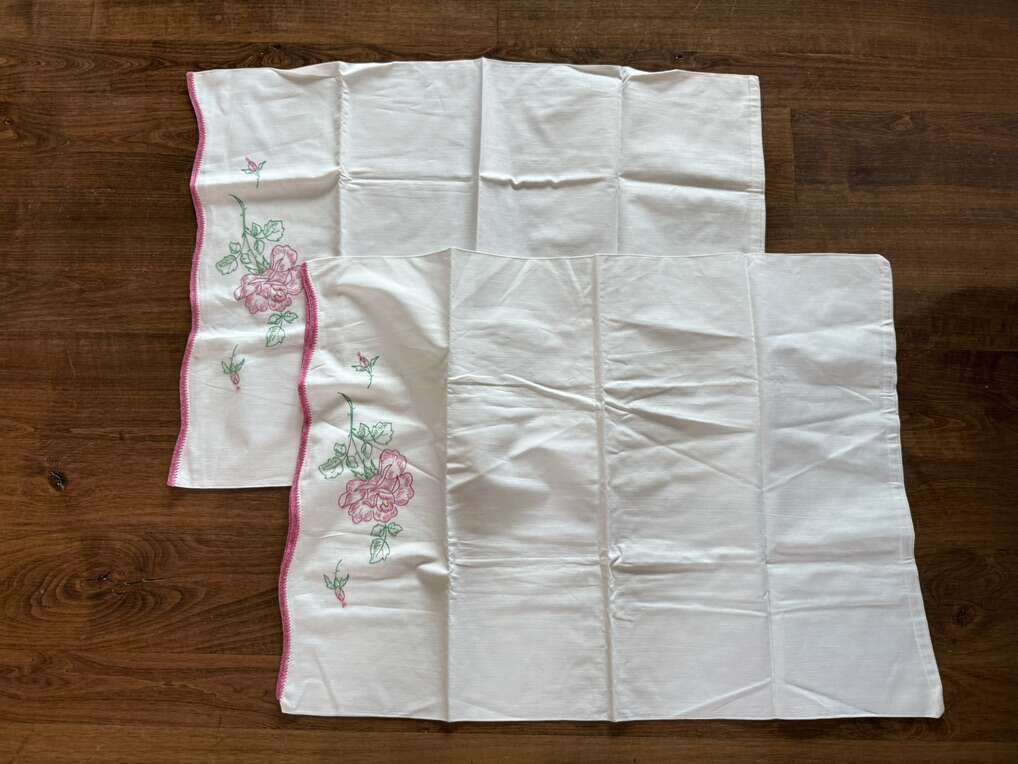 Set of 2 antique standard sized embroidered pillowcases 30 X 21 pink roses one has a spot on it.