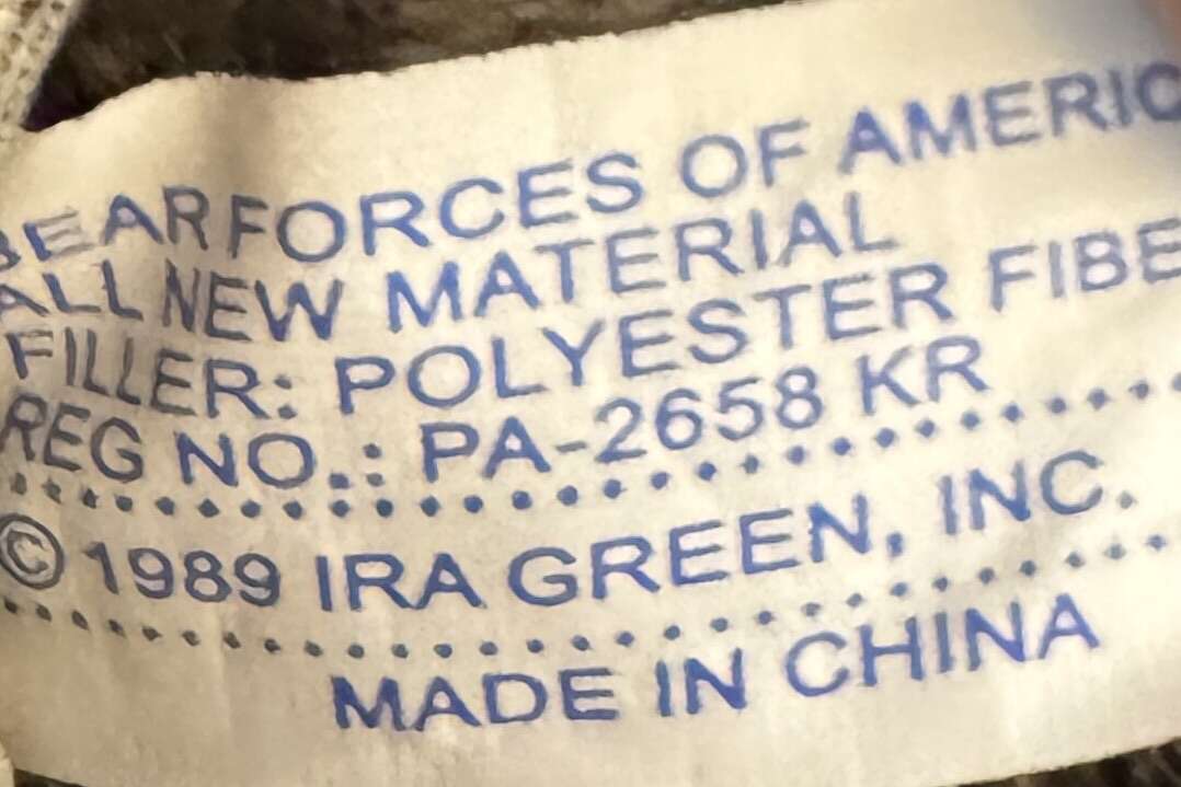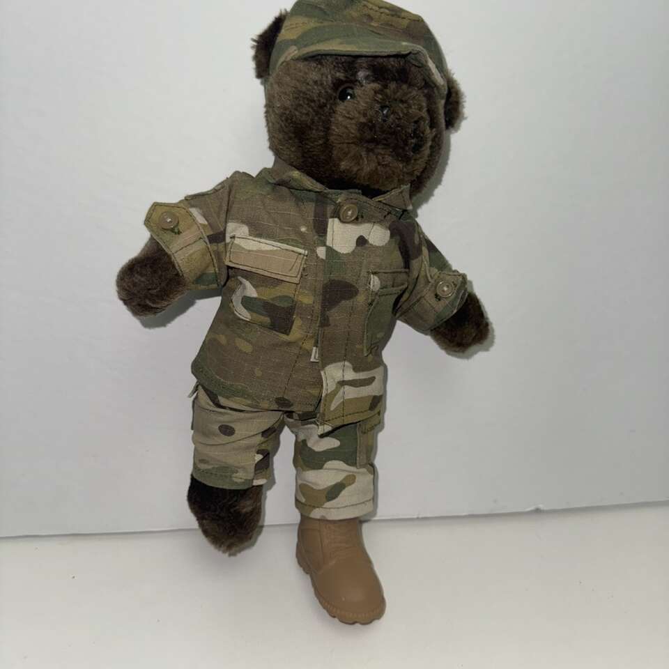 The 1989 Bear Forces Of America Plush Teddy Bear Toy is an 11-inch vintage collectible featuring a military-themed design. This plush bear comes with clothing and a hat, representing a soldier character from the Bear Forces of America franchise. Manufactured by IRA Green Inc in 1989, this brown bear with brown eyes is perfect for all occasions, making it a unique and nostalgic addition to any collection of plush bears or military memorabilia.
