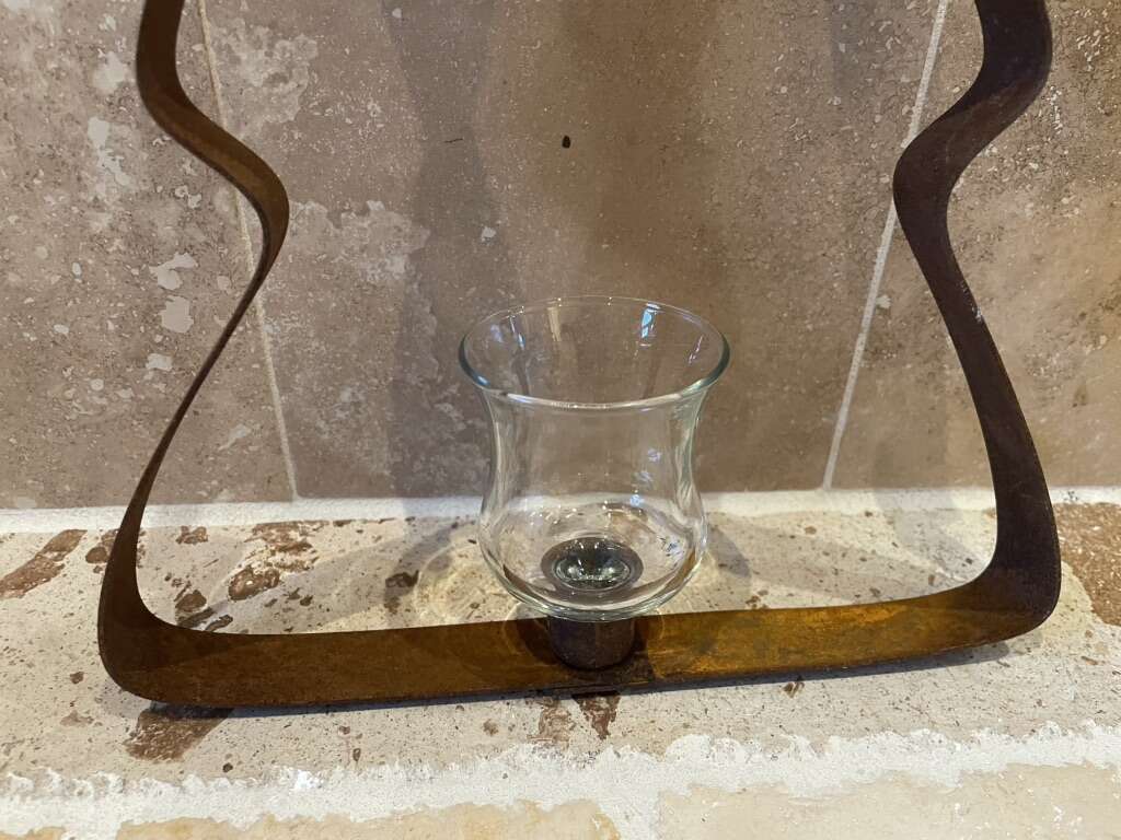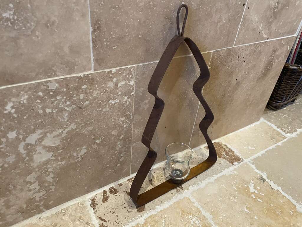 I have a large metal pine tree or Christmas tree that hangs on a wall. It has a glass votive candle holder in the center. It is a rusty brown color. It is 15 inches tall and 9 1/2 inches wide. See my other ads for jewelry, artwork, home decor and more.