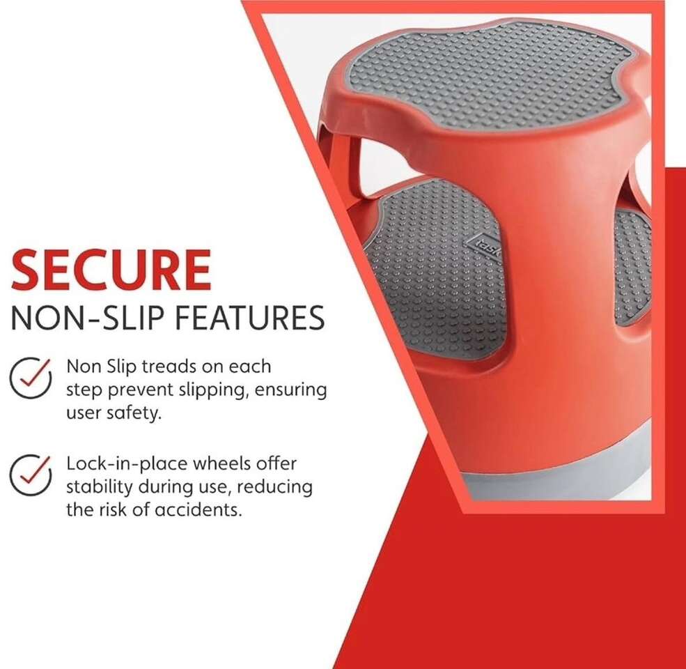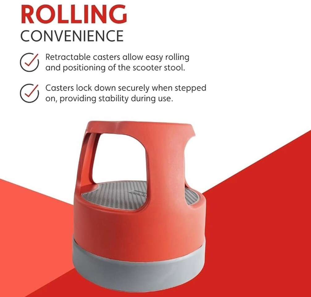 Cramer Scooter Stool, Round, 2-Step, 15, Step and Lock Wheels, 300 lb Capacity, Red