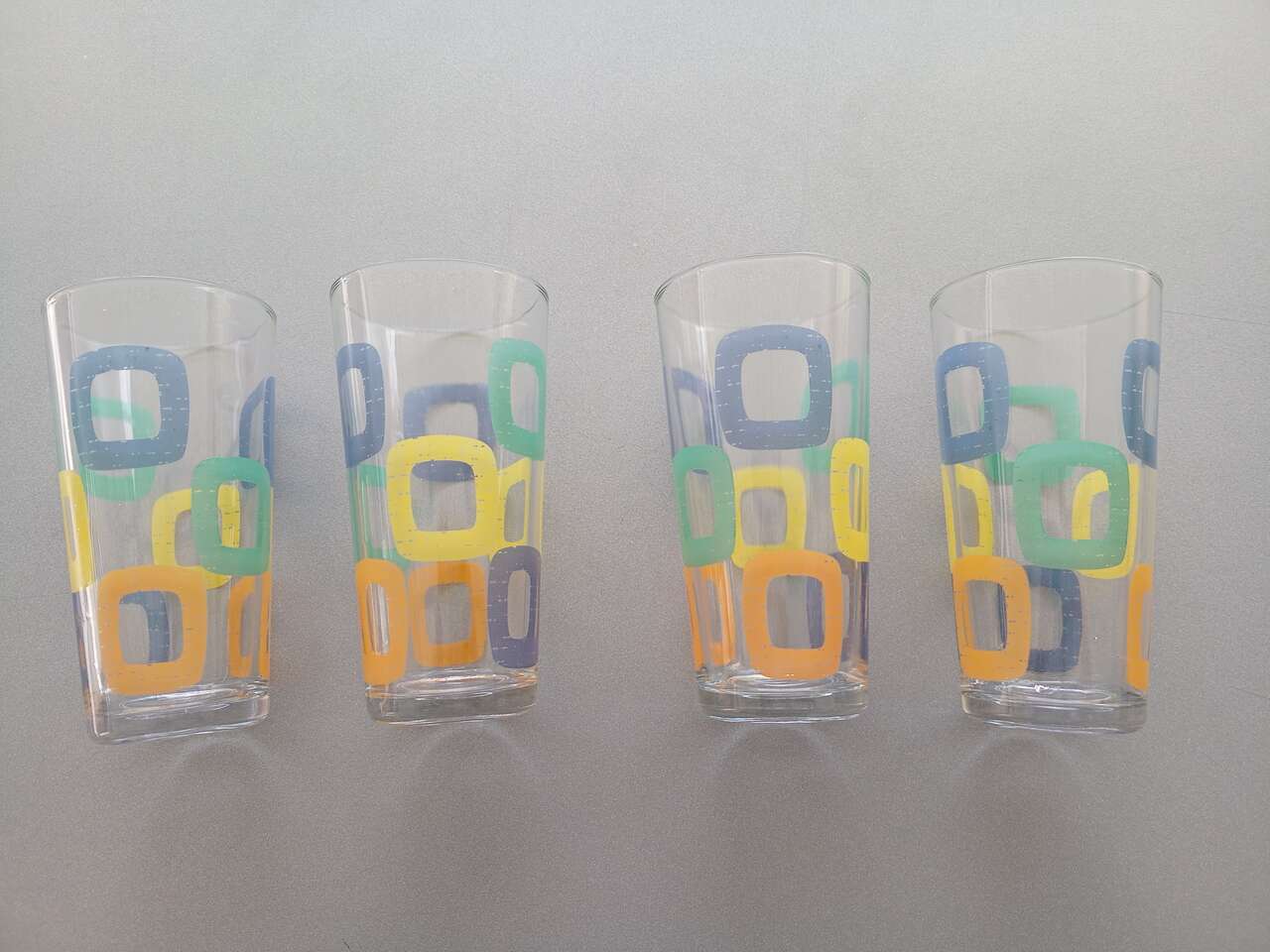 Four Dinner Plates, Four Coffee Cups, Four Beverage Glasses. Green and Blue. No chips, or cracks. Never been used. Without original box.
