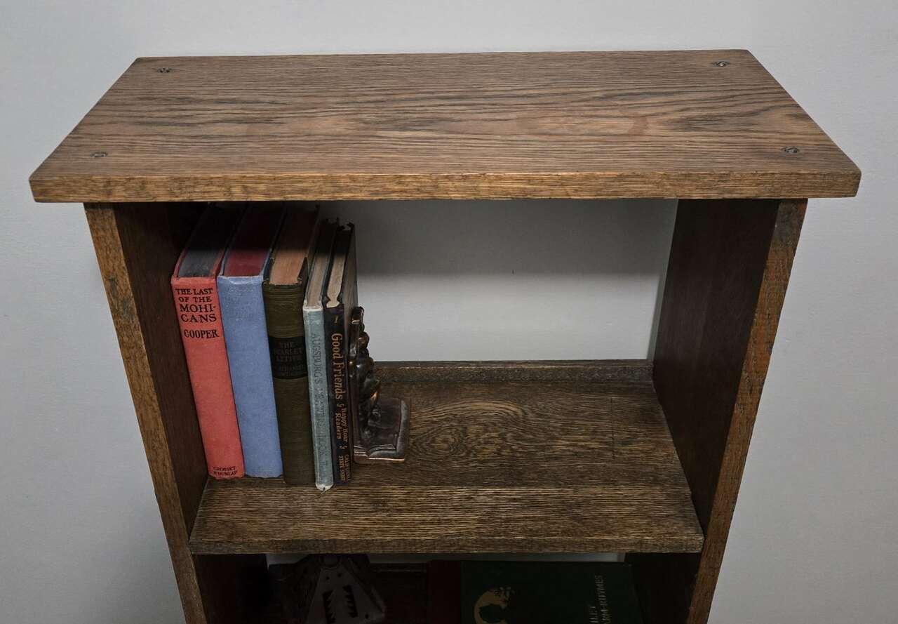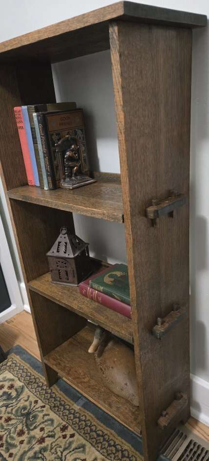 Antique Oak Arts and Crafts 3 shelf bookcase with wedge mortisse and tenon construction. dates early 1900's. Dimensions 10"× 20.5 x43"