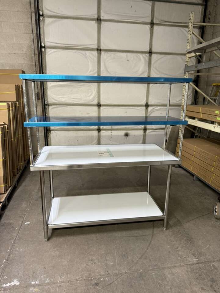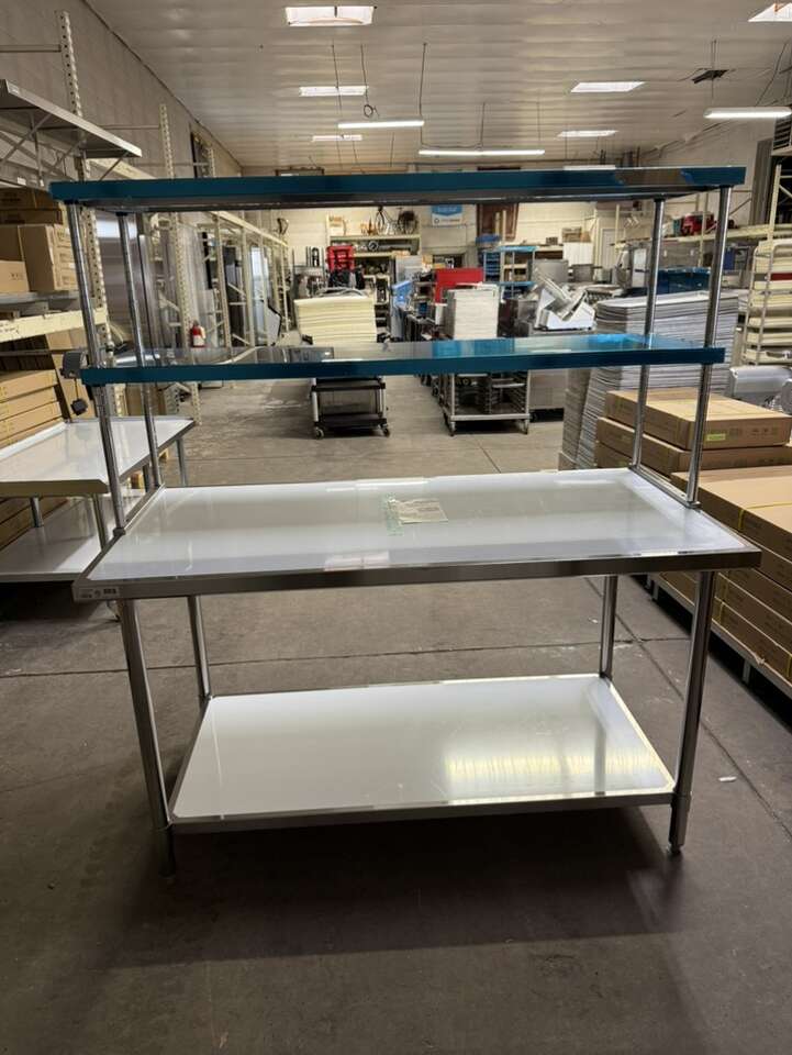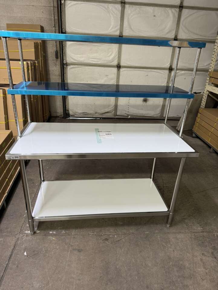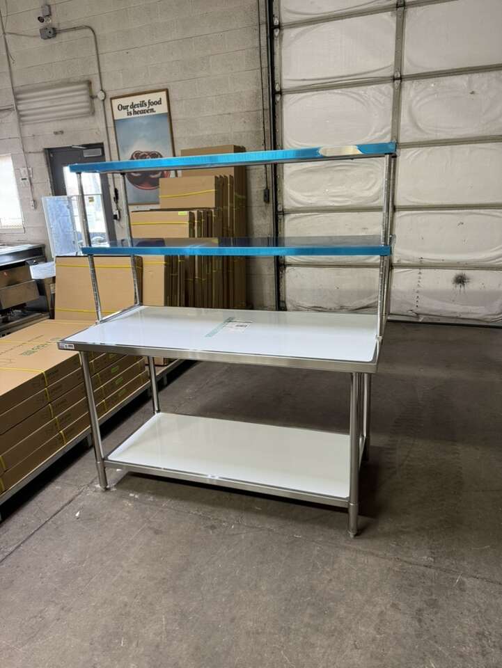 New 30”X60” stainless steel table with stainless steel double tier overshelf 18”X60” heavy duty on special sale in stock.$895