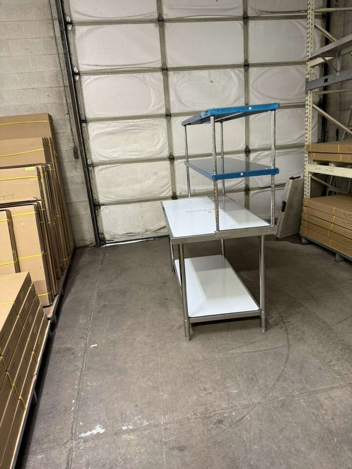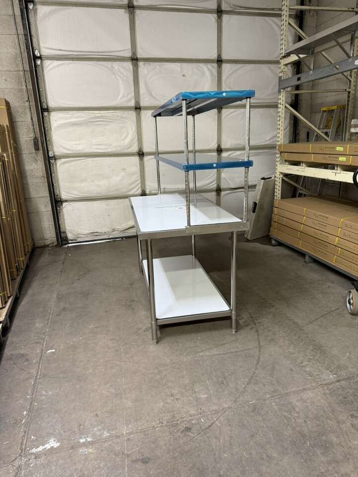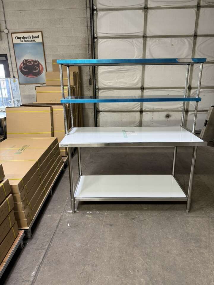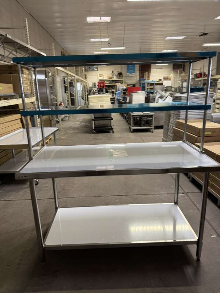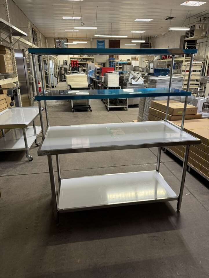 New 30”X60” stainless steel table with stainless steel double tier overshelf 18”X60” heavy duty on special sale in stock.$895
