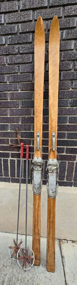 Beautiful vintage wooden down hill snow skiis. Hickory wood skiis with original poles with leather straps. Great for rustic cabin or lodge decor.