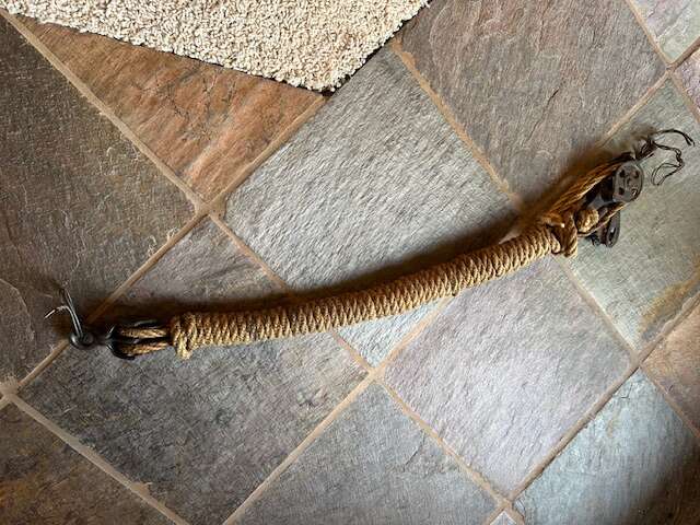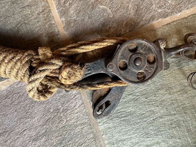 VenmoThis is a very old barn pulley with rope. Beautiful condition and great conversation piece