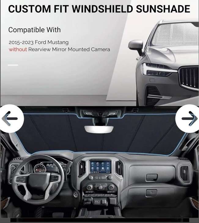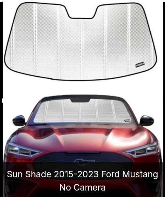 VenmoFactory Standard Construction: 2015-2023 Ford Mustang without Rearview Mirror Mounted Camera UV Protection: Keep your car's upholstery, dashboard and trim safe from harmful UV rays. Heat Reduction: Reduces the temperature inside the car on hot days and prevents the car from heating up while parked. Durable and Sturdy: Reflective aluminum film and multi-layer rigid construction ensure long-lasting performance. Easy to Use and Store: Accordion folding design comes with a storage bag.