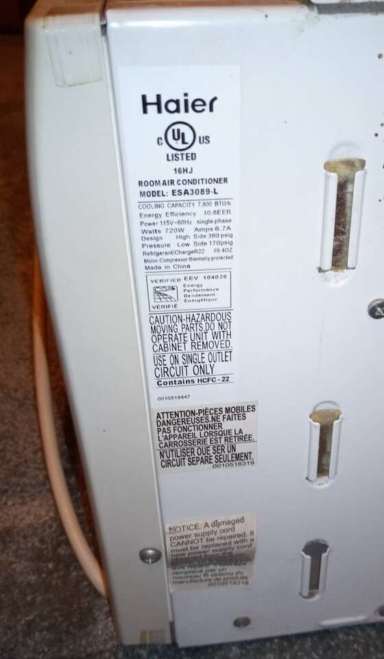 Price Reduced This Haier window air conditioner, model number: ESA3089-L (7,800 BTU/hr) needs repair. It was purchased new, and only used for a couple of seasons, periodically. It stopped putting out cool air. Otherwise, it was functioning fine. It was not exposed to the elements, as it was protected by a covered porch. I am suspecting it may need to be recharged (R22), but I don't know. Sold as-is. Cash or Venmo only.
