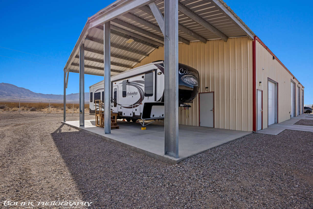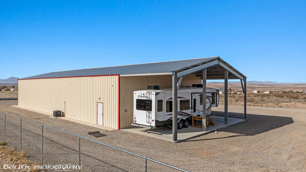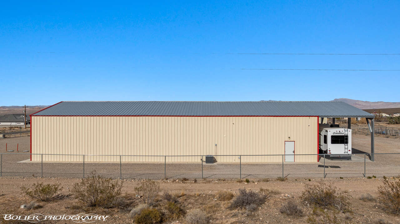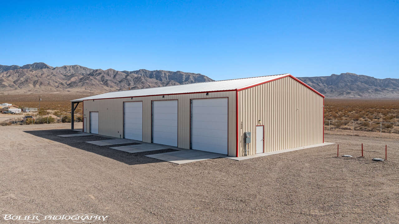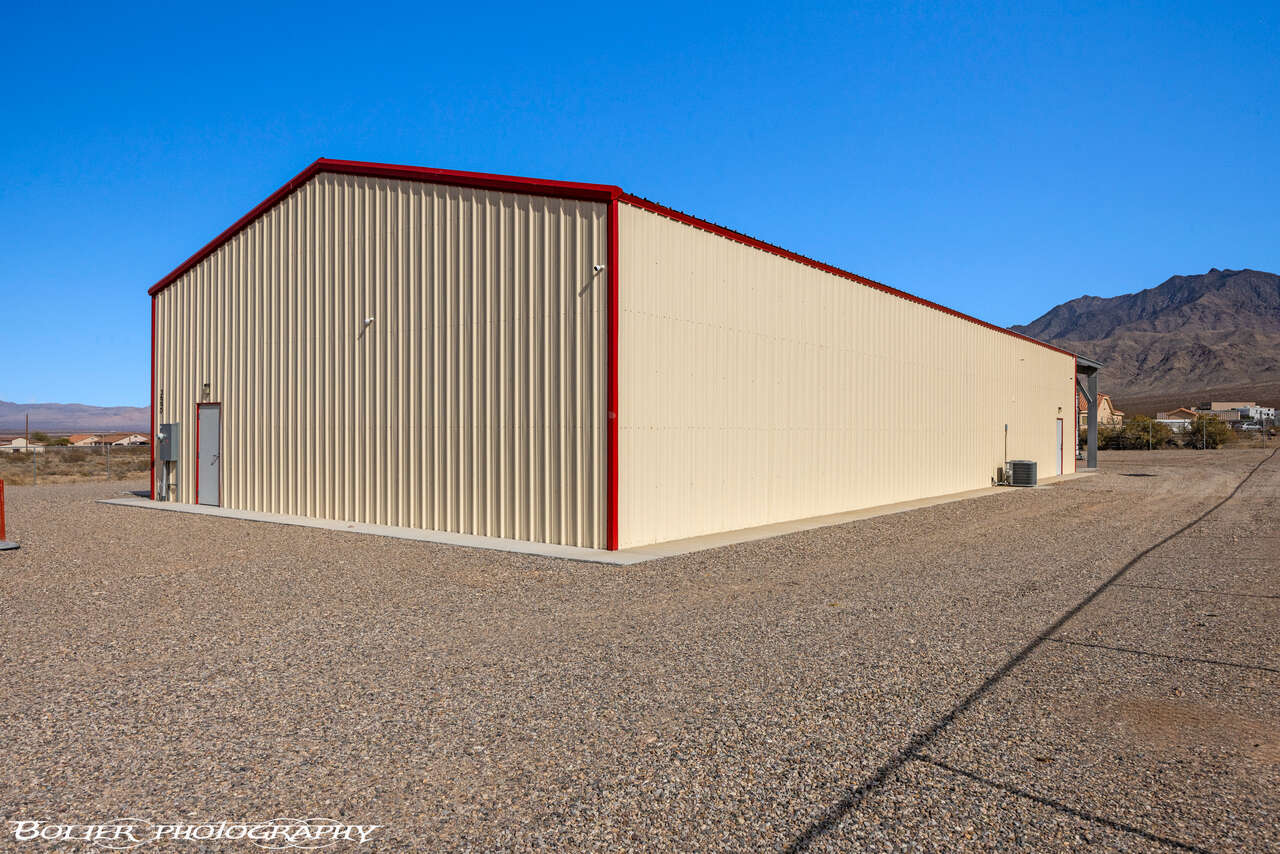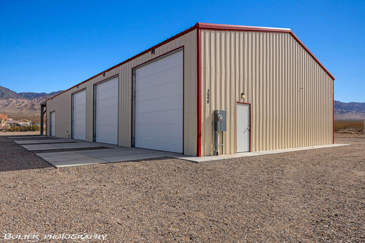 Looking for the Ultimate Space to Store Your Toys, Run a Business, or own your Dream Shop? This prime property is located at the corner of Scenic Blvd and Elbow Canyon Rd, just 6 miles from Mesquite, NV. Built in 2023, this brand-new, steel structure spans 4,500 sq. ft., with a 100’ x 45’ layout and 18’ ceilings, offering endless possibilities. Whether you’re a hobbyist, business owner, or looking for a place to store your toys, this property has it all! Features: 1.06 Acre with option to purchase adjoining 1.06 Acre. RV Pad: Covered 20’ x 45’ area Three distinct spaces: Space #1: 1,800 sq. ft. workshop with climate control, two man doors, and a 10’ x 10’ insulated automatic overhead door. High-output LED lighting, sealed concrete floors, 5-ton HVAC, Rapid Air line system, OSB board protecting the insulation, and a half-bath. Washer/dryer w/ hookups. Space #2: 2,700 sq. ft. shop with three 14’ x 14’ insulated automatic Martin doors, designed for large RVs. 8’ x 14’ pallet racks, new 7.5 HP Jet air compressor, air fittings, and regulators. Integrated covered RV space with 50-amp service, sewer clean-out, and water bib. Additional Highlights: Security: Ubiquiti Dream Machine system with 12 cameras Fencing: Fully fenced with a 6’ chainlink heavy-duty fence, professionally installed by United Fence of Salt Lake City Private Water Supply: New 575’ well with 1 shared and 2 additional shares for sale Septic System: 1,250-gallon septic tank Gate Access: 20’ rolling gate with 4’ man gate Perfect for your ultimate man cave, a turnkey workshop, or a commercial space with plenty of room for toys, RVs, and anything else you need to store. Sunny northwestern Arizona is calling! Don’t miss this opportunity!Call Trent Graves at Premier Properties for more details or to schedule a showing: 702-682-1277 View the listing online: https://www.showthisproperty.com/3990-scenic-blvd/mls