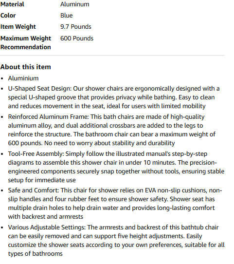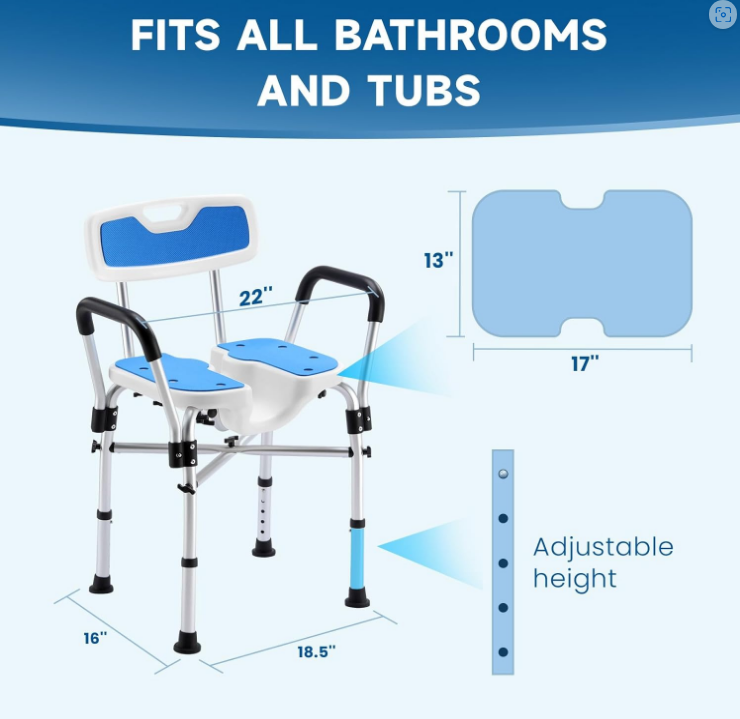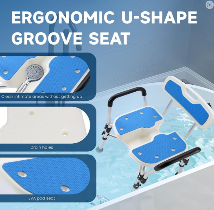 NEW IN BOX! U-Shaped Shower Chair for Inside Shower, 600lbs Heavy Duty Shower Chair for Elderly and Disabled, Reinforced Crossbar Shower Chair with Arms and Back, Height Adjustable Bath Chairs for Seniors
