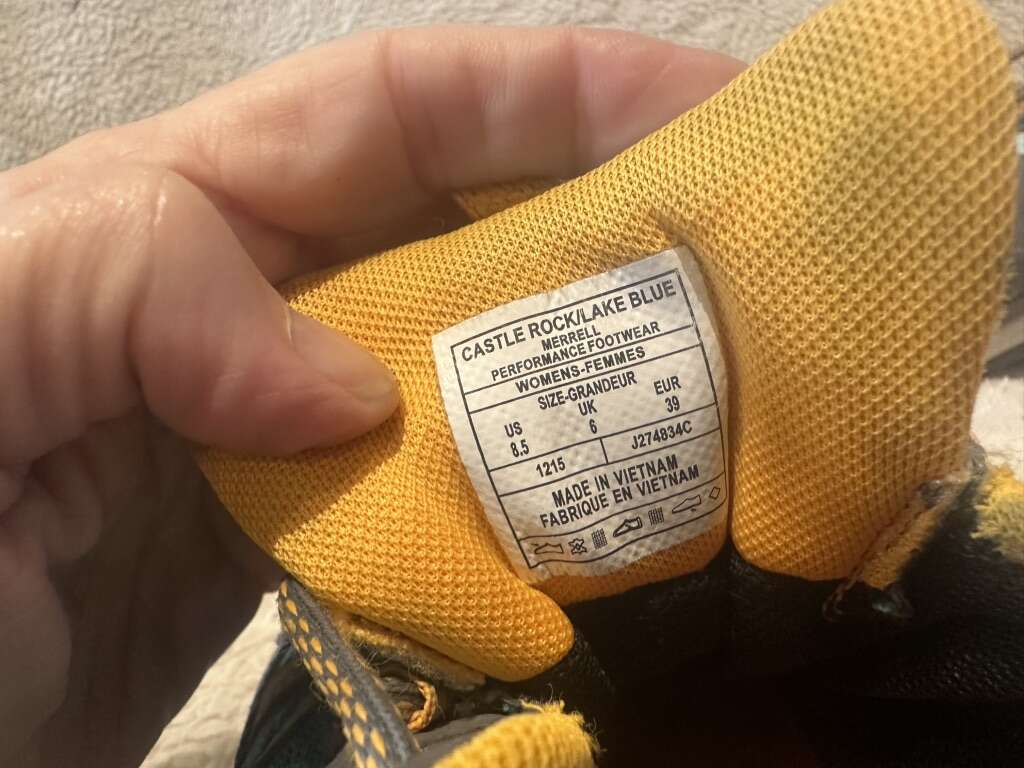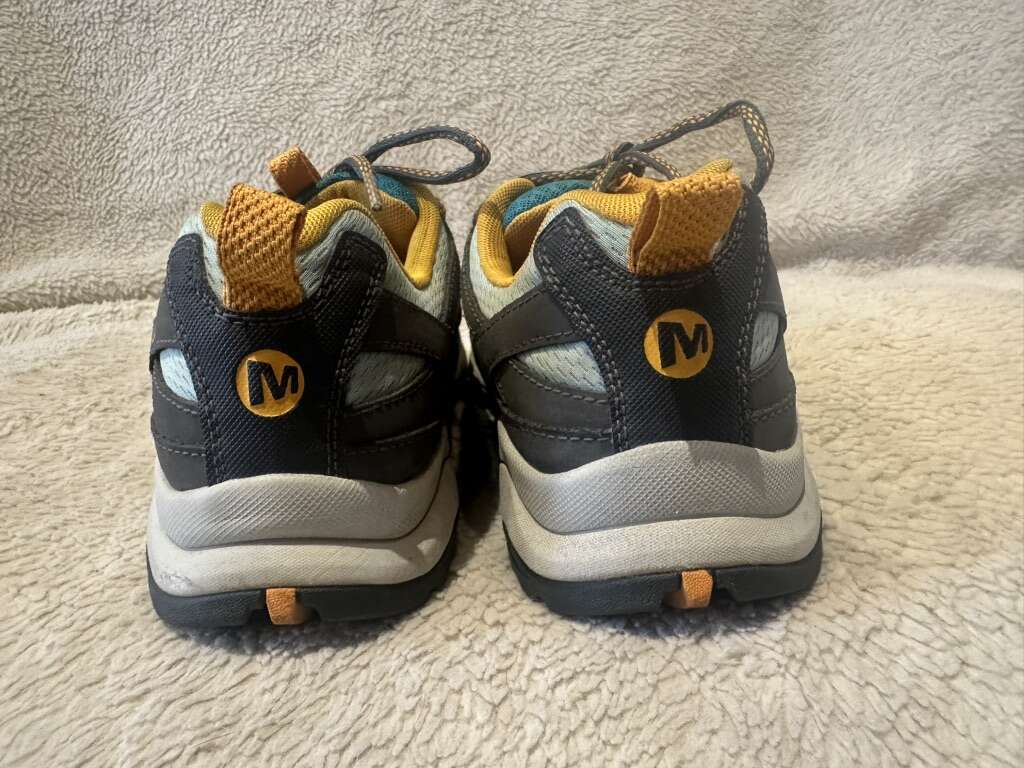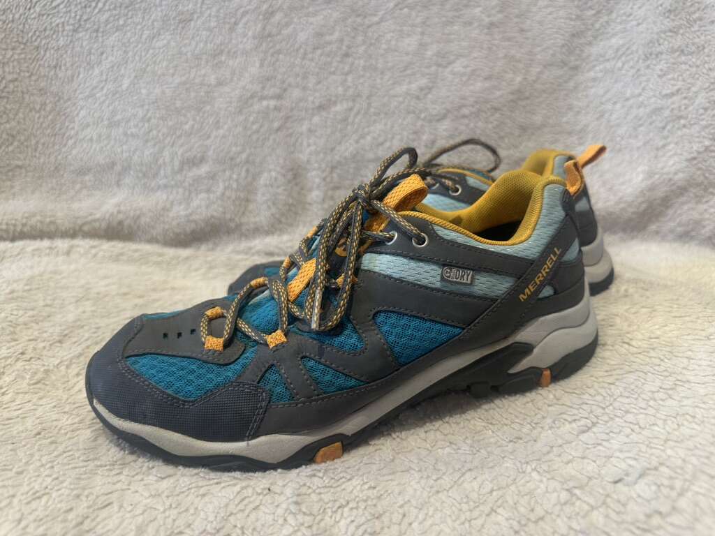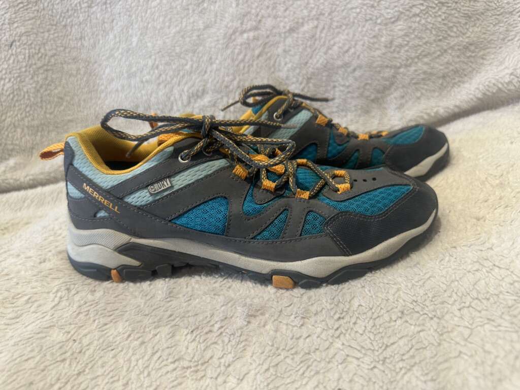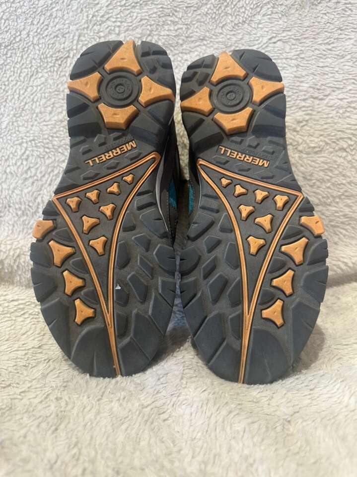 Merrell women’s size 8.5 teal mesh and leather with orange trim, waterproof, hiking or trail shoes. These are in good condition, see photos for details. I take cash or Venmo, but cash is preferred. Text is best. 8012014446. Check out my other ads for additional sizes and styles.