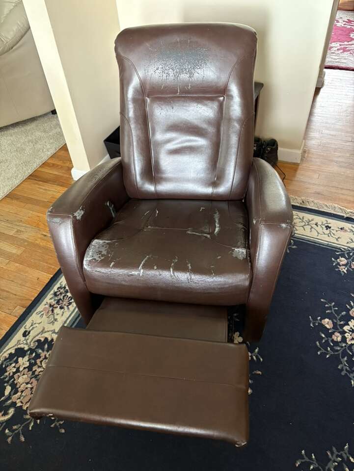 Brown simulated, leather reclining swivel chair. Shows some wear, but with a soft blanket or light cover it functions beautifully .