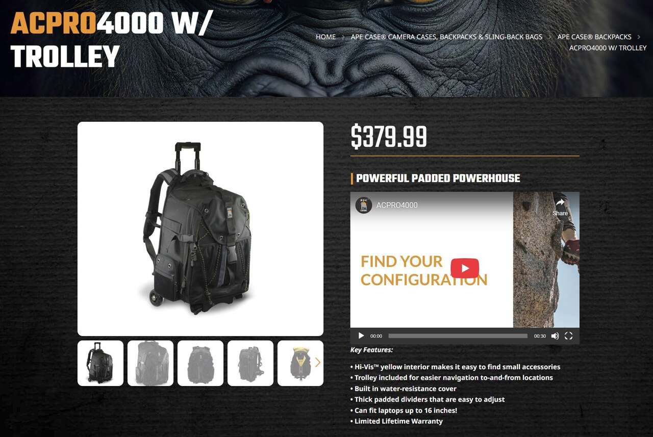 This classic Ape Case® backpack is ready for your next photography journey! Black Outside. Yellow Inside. TOUGH ALL OVER! Our ever-popular ACPRO2000 model has undergone an upgrade, which inspired the ACPRO4000, equipped with a removable trolley. Perfect for today’s photographers who are constantly on the move.