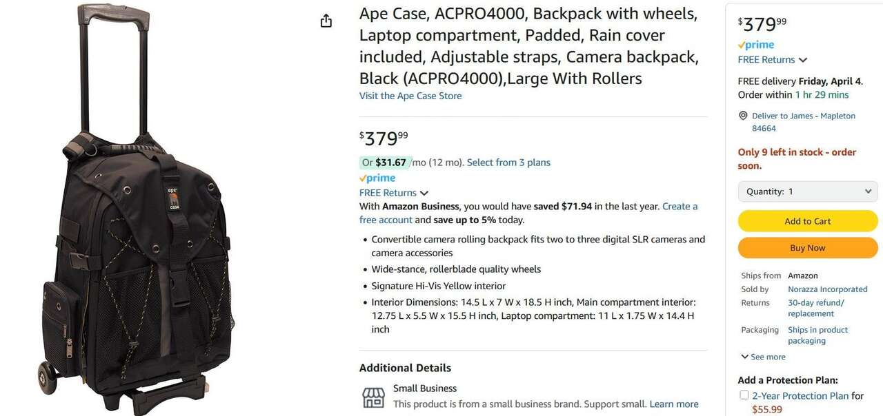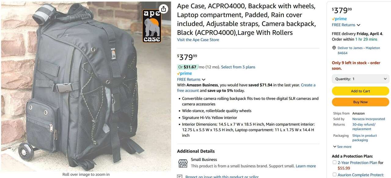 ApplePayModel ACPRO4000 Professional Convertible Rolling Digital DSLR Backpack.