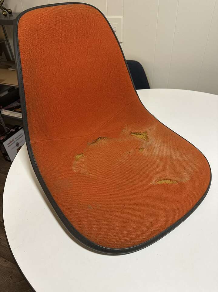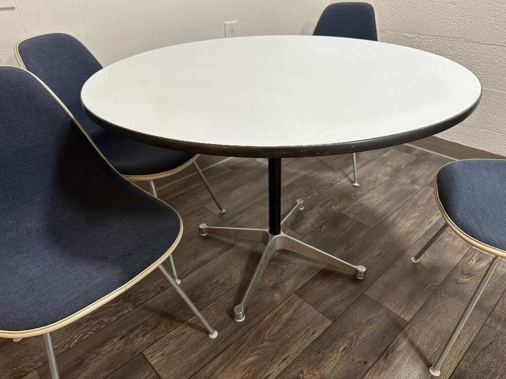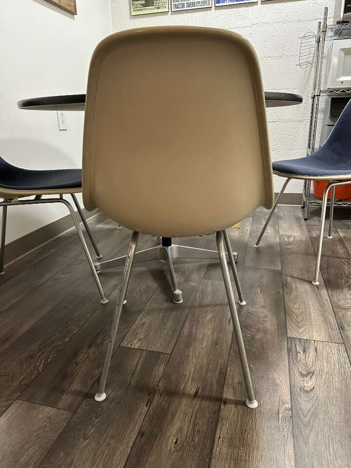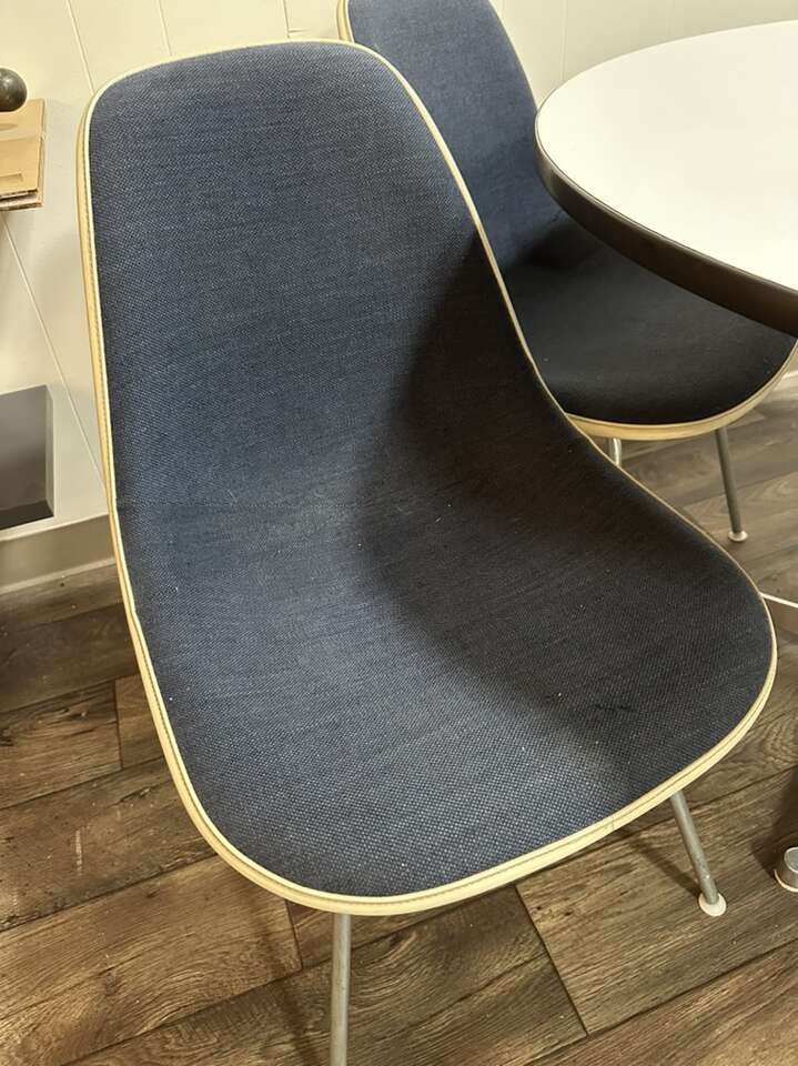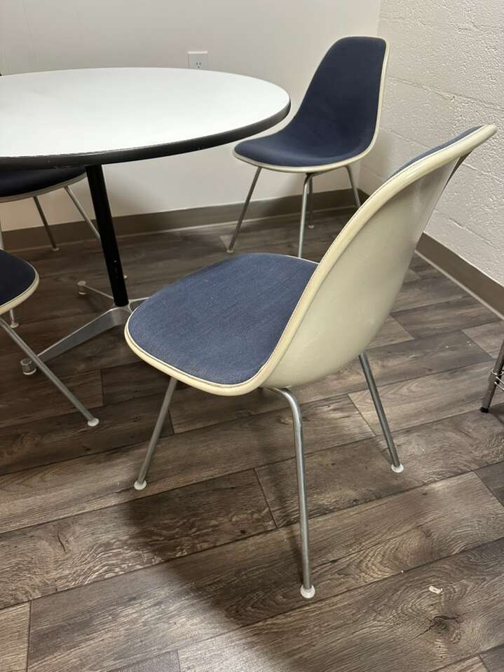VenmoThese are all authentic Eames chairs and an Eames table. The fiberglass shells are white with blue fabric on original H bases. Included are 4 chairs that are blue & white and I’ll throw in an orange & white, and red & white project condition shells if you want it. That’s 6 total chairs and the table. Must pick up in Layton.