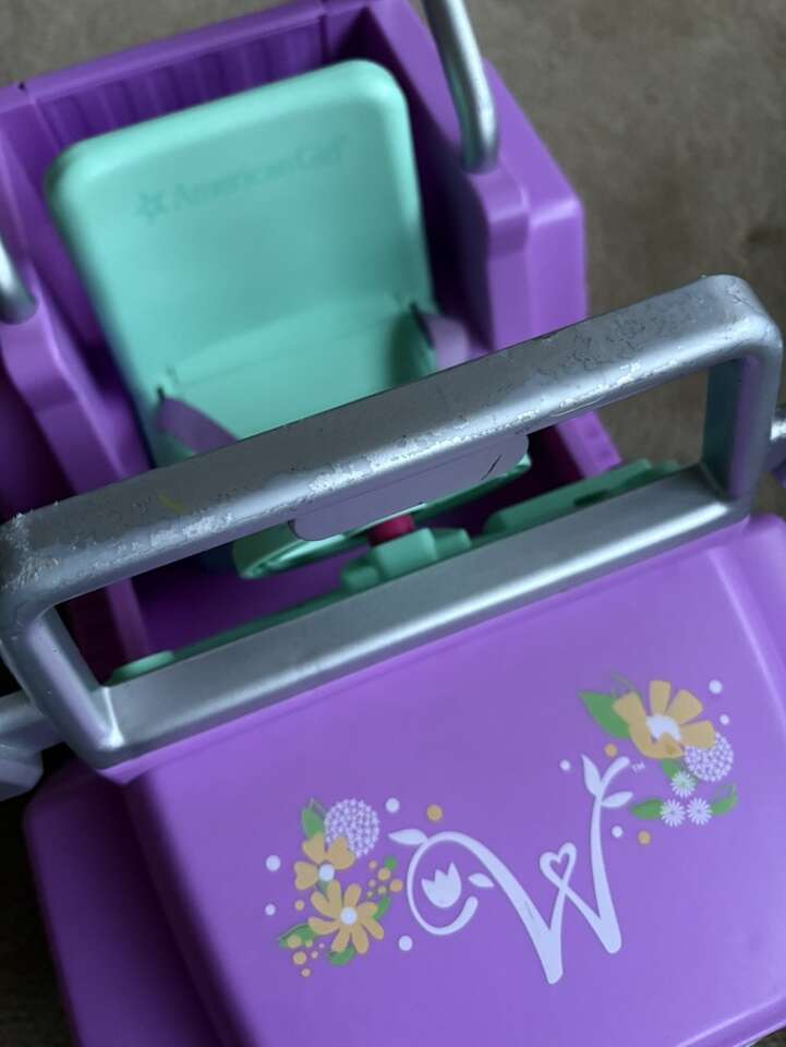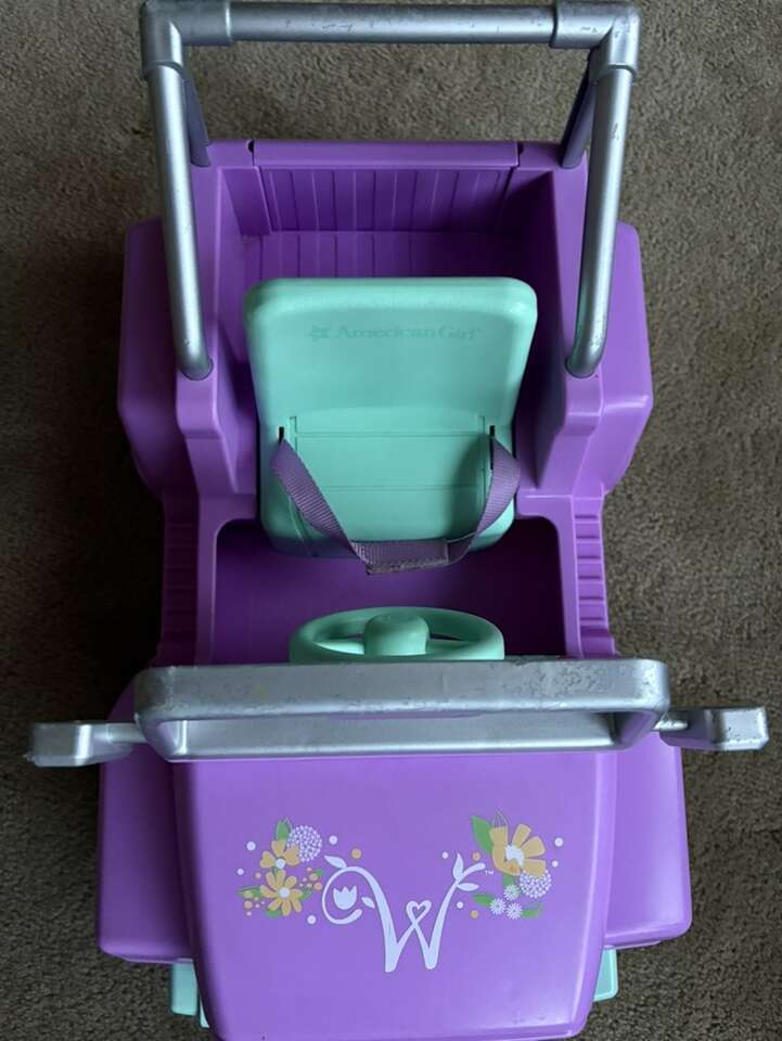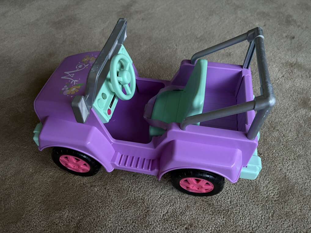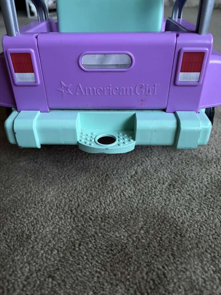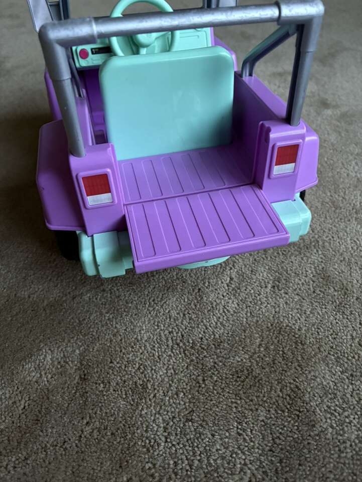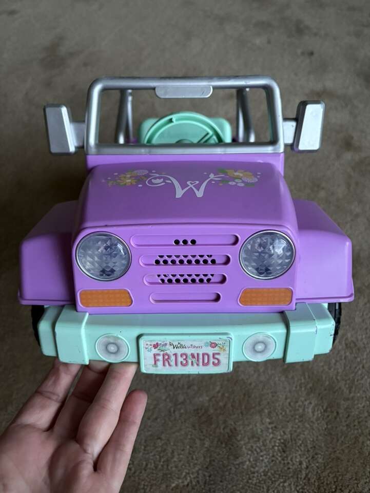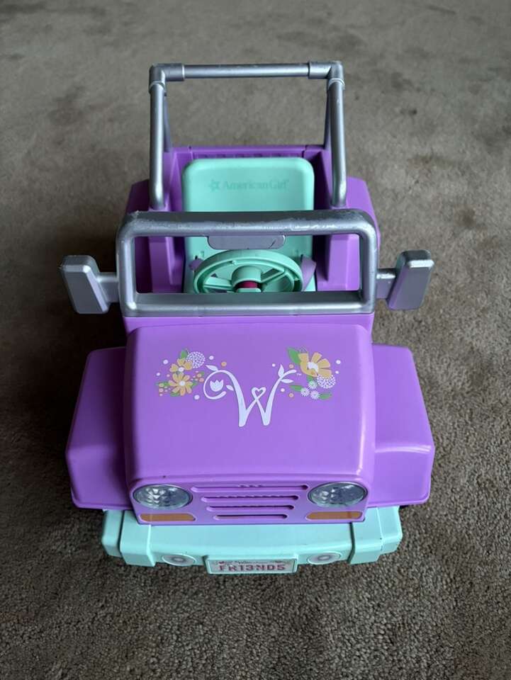 American Girl Wellie Wishers Garden Adventure Jeep. For 14” Wellie Wisher dolls. Wheels, tailgate, steering wheel, Velcro seatbelt, lights & sounds work. Well-made toy. Very good condition—some wear on silver frame (see photos). Text only. Cash or Venmo.