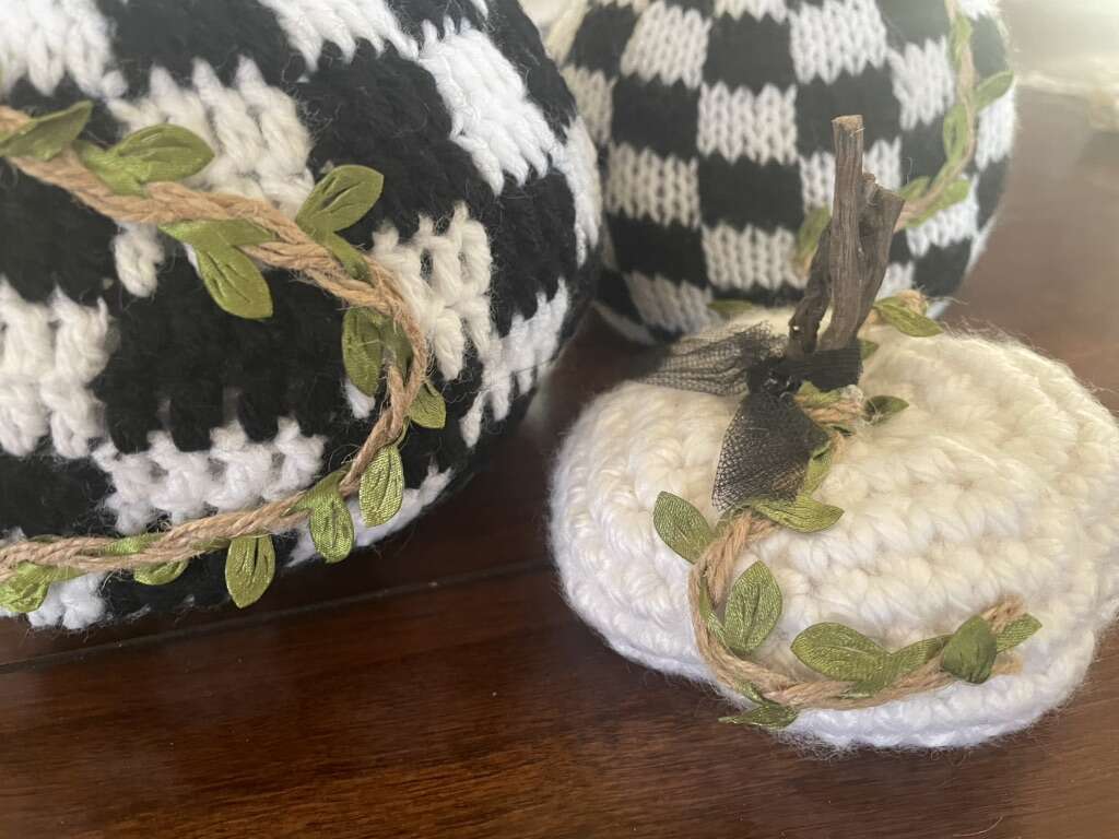 I have 3 like new knitted pumpkins. 2 are black and white checks and 1 is solid white. The biggest is 8 inches tall and 8 inches across. The middle one is just over 6 inches tall and 5 1/2 inches wide. The smallest is just over 4 inches tall and 4 inches wide. They each have cute tan vines with green leaves. The price is for all of them together. See my other ads for jewelry, artwork, home decor and more.