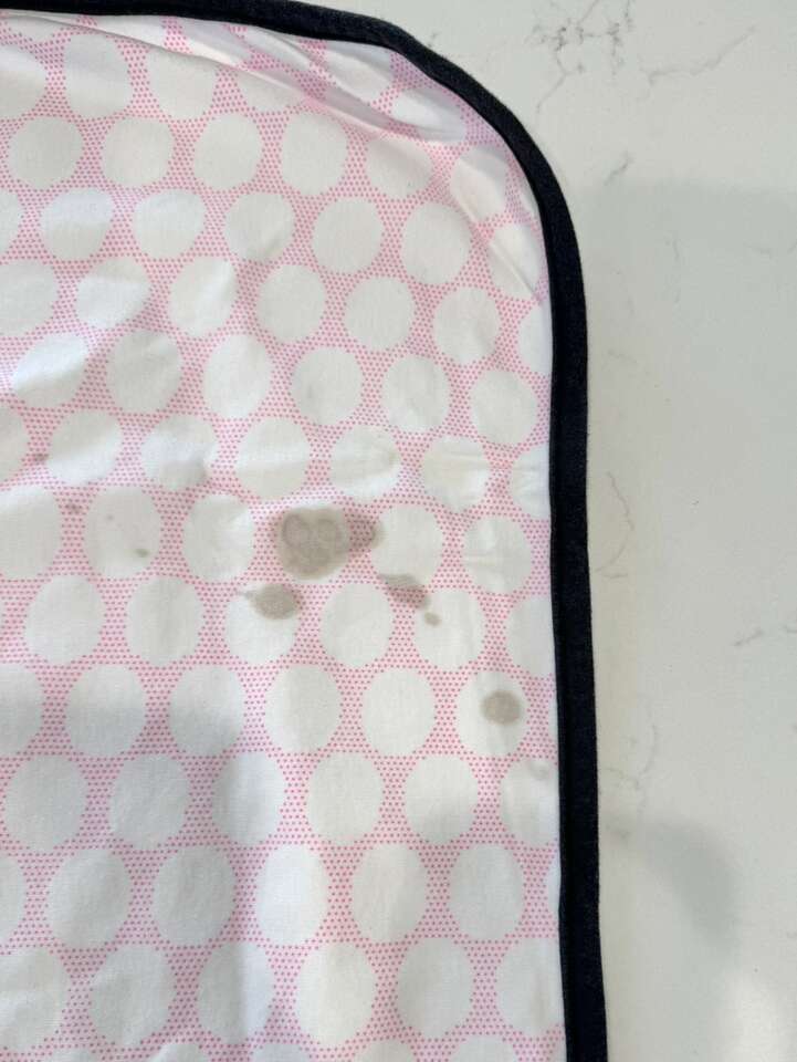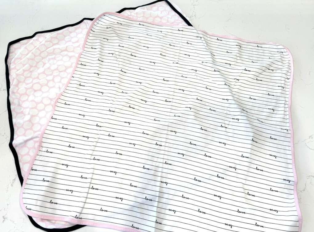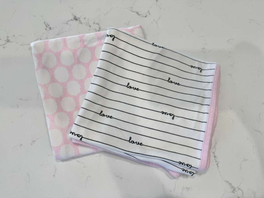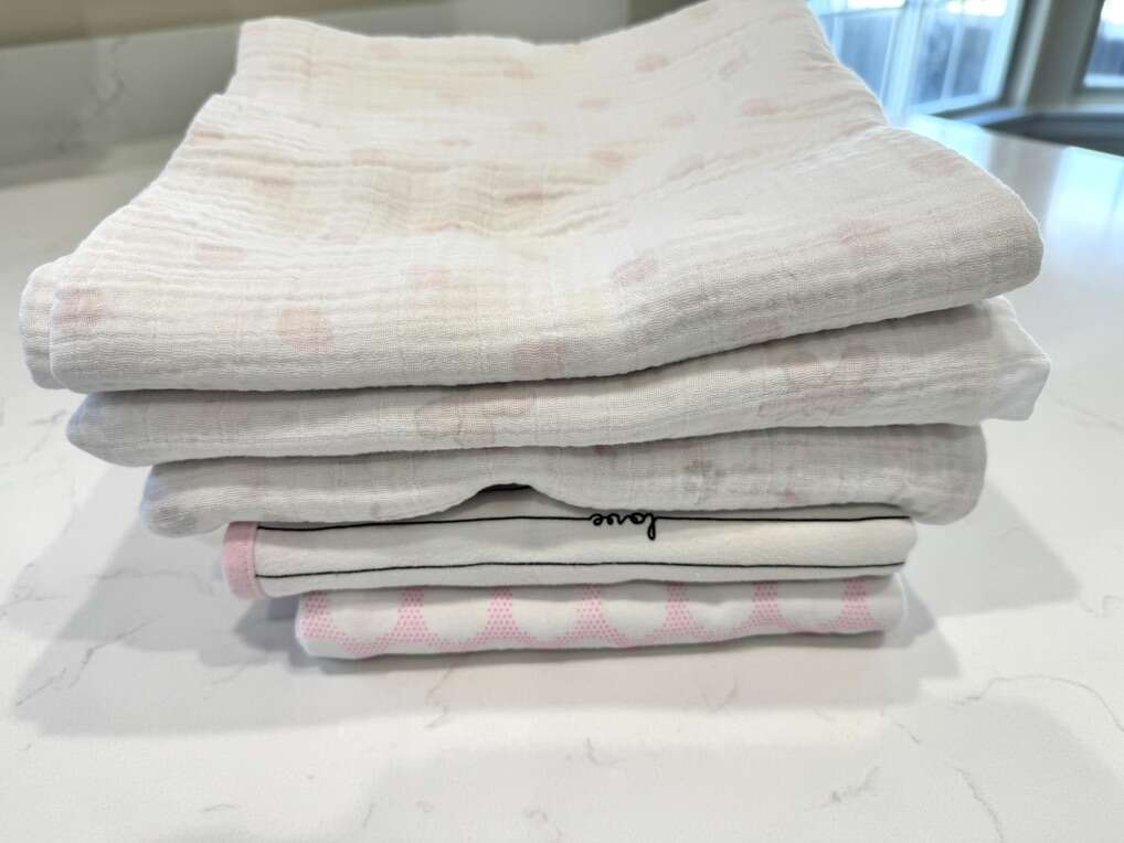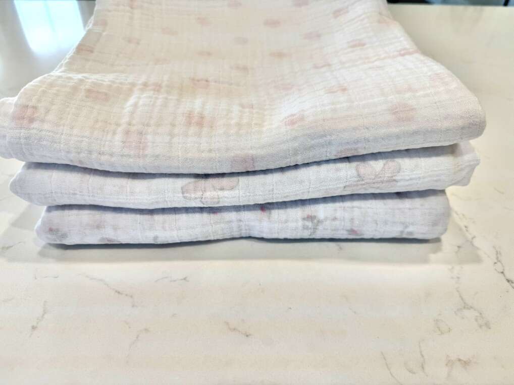 VenmoThis bundle has five baby girl swaddle blankets. Two are cotton and three are muslin. The muslin blankets are thinner but larger than the cotton ones. There is a stain on the blanket with black trim.