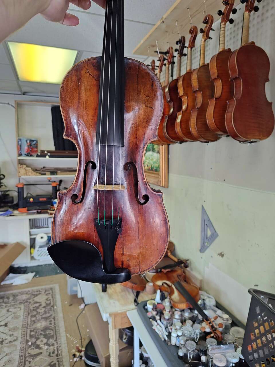 Retail of $18,000, only asking $3,500 because of repairs to the top which are solid and stable and do not pose any problems for the violins but devalue the violin. The violin has a warm, sweet, open sound that is really lovely to play. Have many other fine violins and bows and violas all at wholesale prices. I have been supplying violin shops around the country for many years with violins. You can also buy them direct for me.