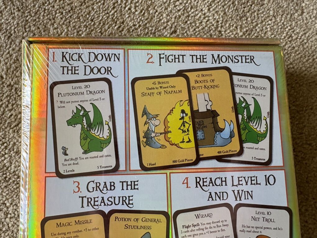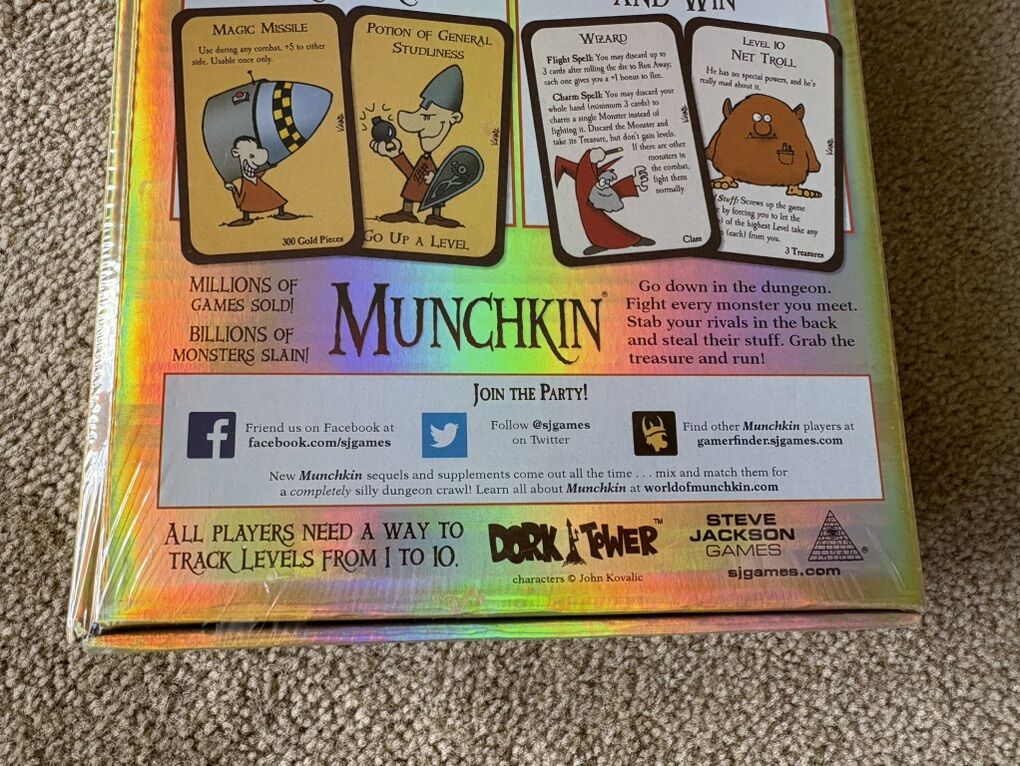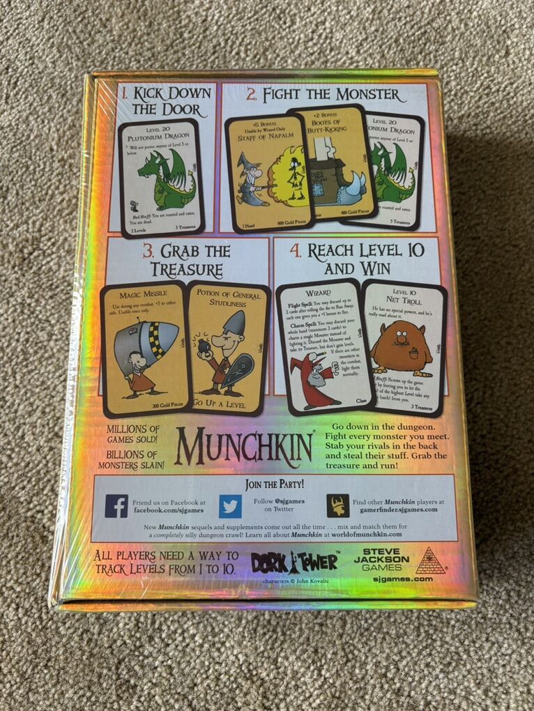 NEW (sealed in plastic) original Munchkin Game: Kill the monsters, steal the treasure, stab your buddy. Steve Jackson Games, 2014. 3-6 players, age 10+. New, unopened condition. Text only. Cash or Venmo.