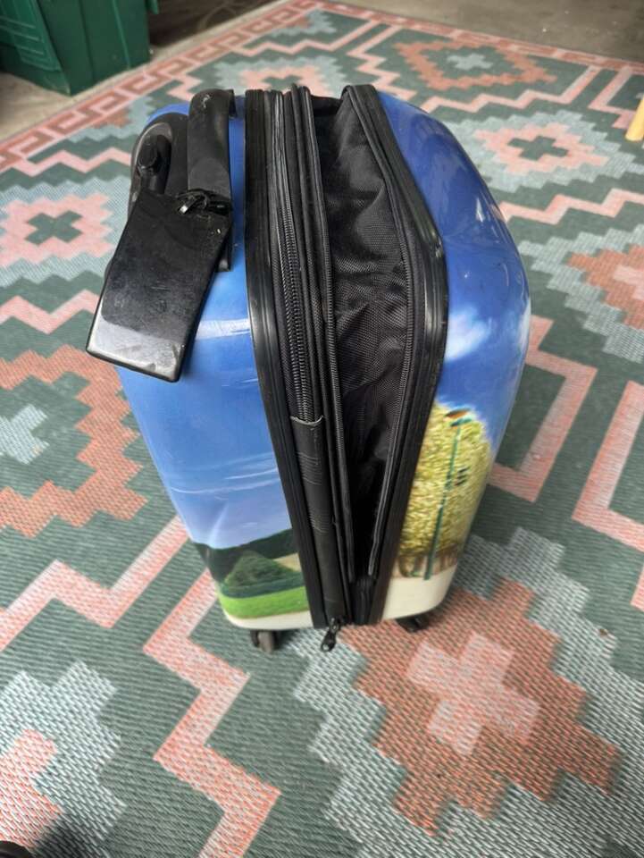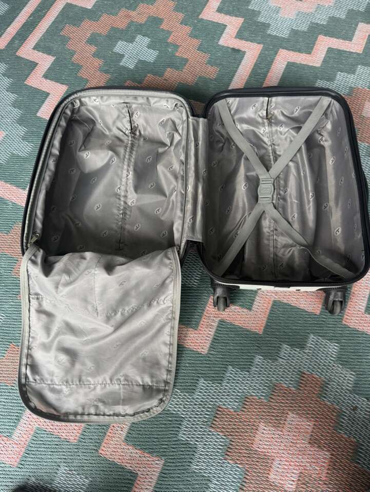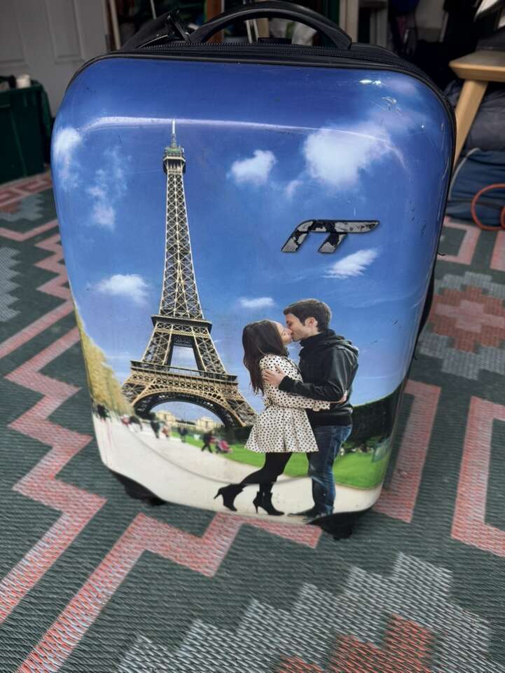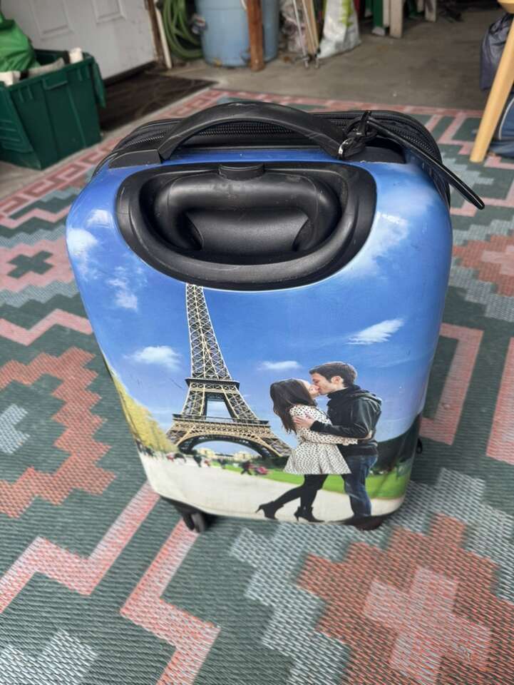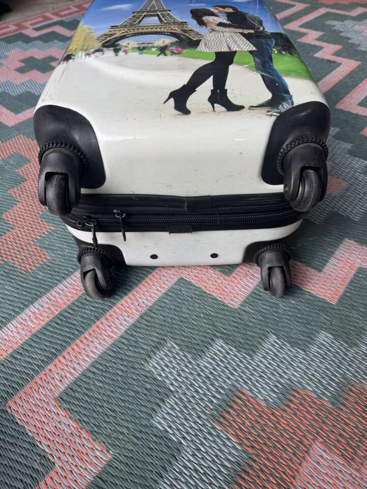 4 spinner carry on hard back luggage. Has Eiffel Tower with couple on it in the city of love.