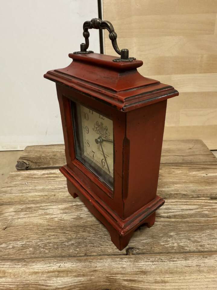 ApplePaySelling a vintage distressed red wooden clock. Clock works, is battery operated. Has a metal handle on top. Clock says, “by special appointment to the Queen” on the face. Inspired by Queen Anne-era bracket clocks. Looks great in any area of the house! Cash/Venmo only, no trades. Call or text anytime with questions!