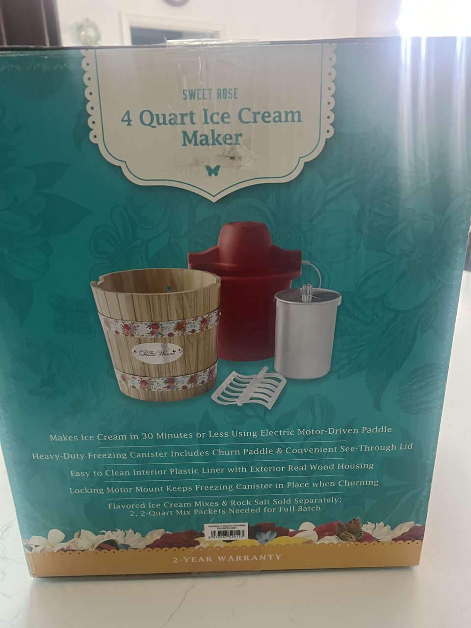 Pioneer Woman Brand Ice Cream Maker 4 Quart. Makes ice cream in 30 minutes or less using electric Motor-Driven Paddle. Heavy-Duty Freezing Canister includes churn paddle and convenient see through lid. Easy to clean interior plastic liner with external real wood housing. Locking motor mount keeps freezing canister in place when churning. Brand new in box. $50.00 cash!