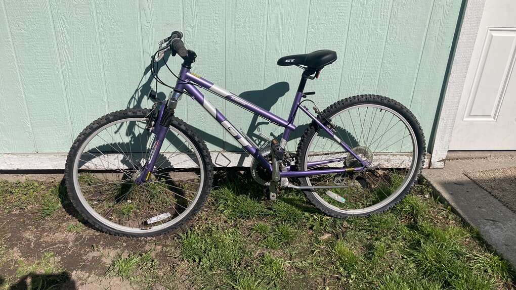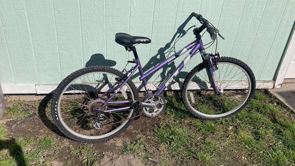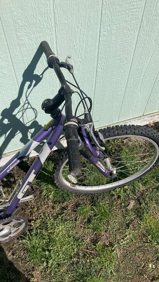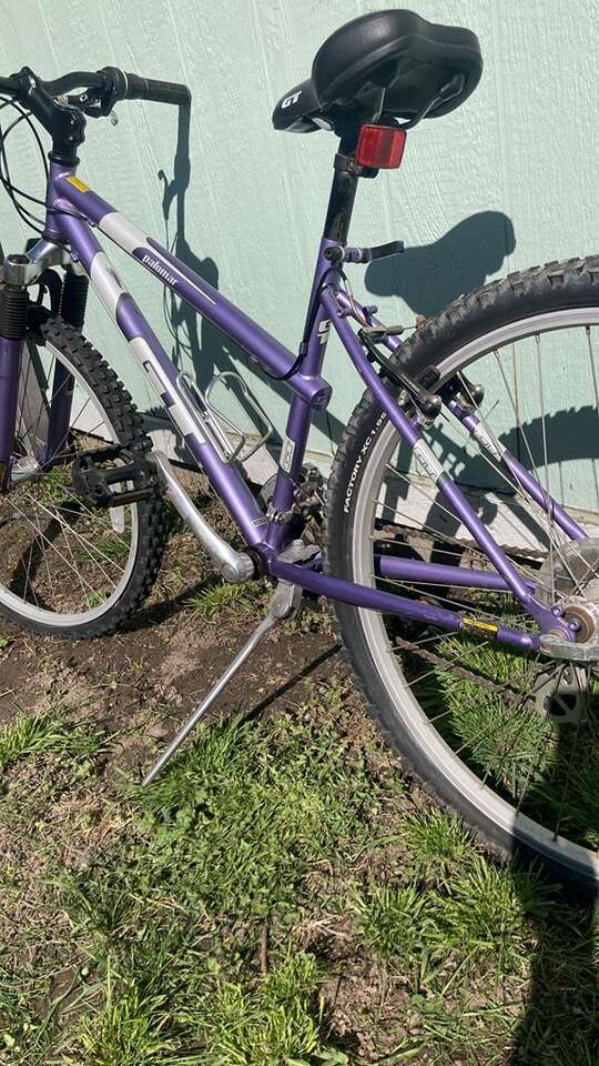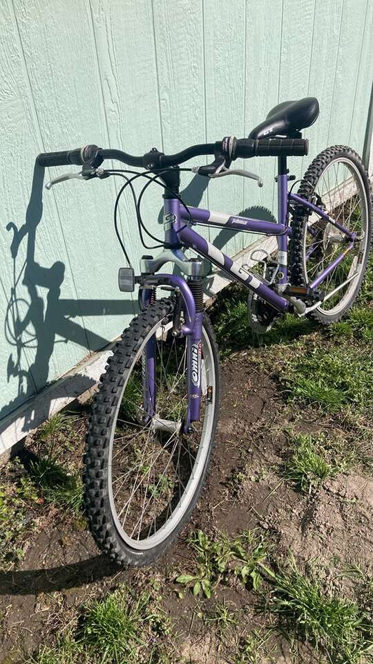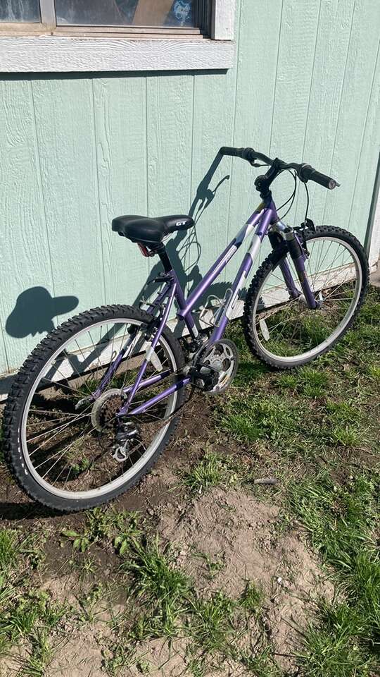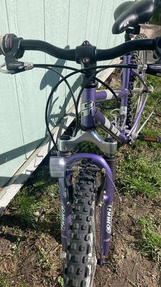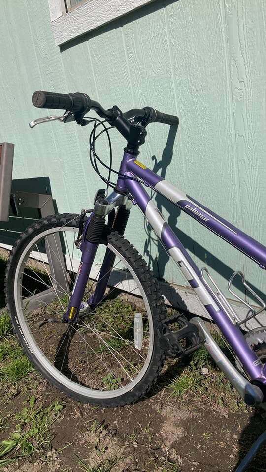 GT Palomar small mountain/commuter bike steel frame wheel size 26, with front suspension color purple, frame size 16 with 21 speed. GT Palomar mountain bike pre-owned in good condition. is going to need new tubes and a tune-up
