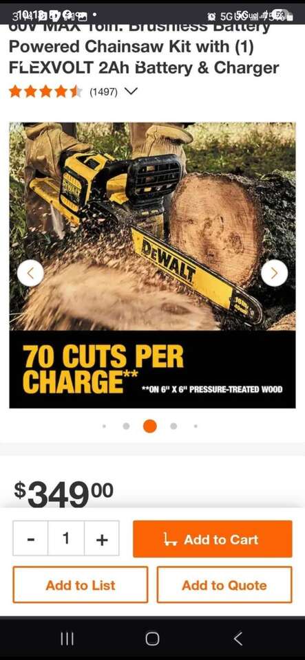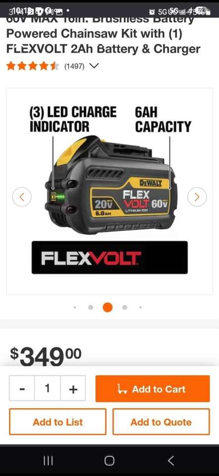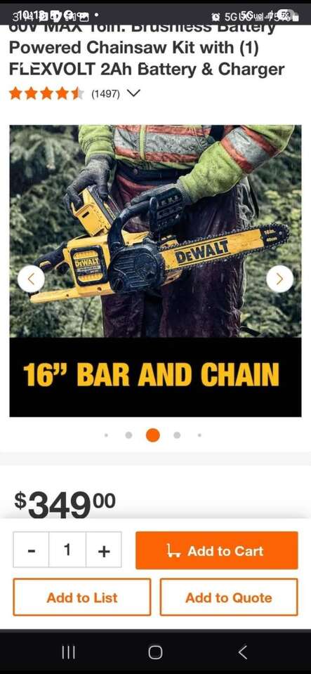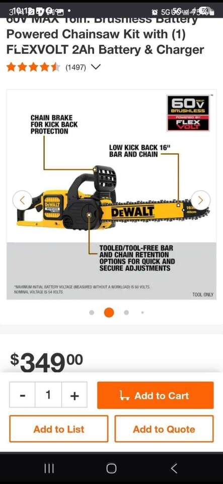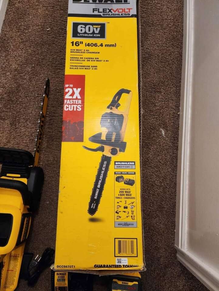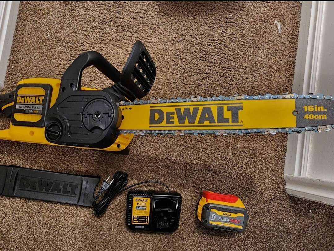 ZelleNew Dewalt 60V MAX 16in. Brushless Battery Powered Chainsaw Kit. Includes one 6AH FlexVolt Battery and charger. Model Number DCCS670T1.